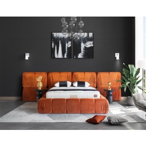 Pat ~AVVENTO~ tip boxspring, ladă de depozitare, structură metalică, saltea premium, aripioare laterale elegante, design sculptural, material catifelat, culoare cărămiziu-portocaliu