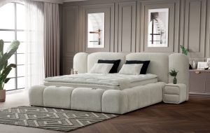 Boxspring ~PALAZZO~ cu lada de depozitare, structura metalica, saltea premium cu topper integrat, material boucle catifelat, culoare simphony Pearl