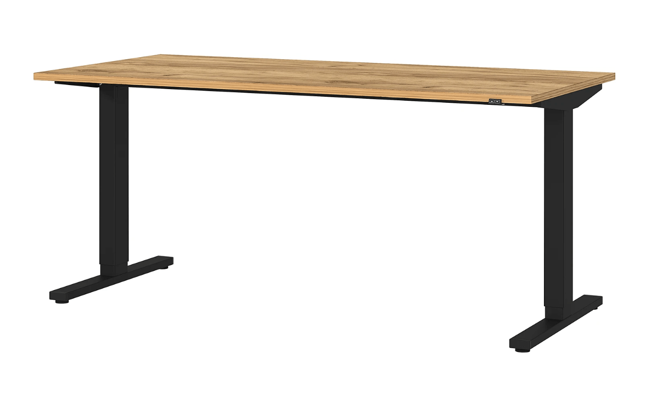 Acest birou modern cu înălțime reglabilă este soluția ideală pentru un spațiu de lucru ergonomic și productiv! Dotat cu un mecanism electric de ajustare a înălțimii, îți permite să alternezi cu ușurință între poziția așezată și cea în picioare, contribuind la sănătatea și confortul tău pe parcursul zilei. Blatul elegant cu finisaj din lemn natural adaugă o notă caldă și sofisticată, în timp ce cadrul robust din metal negru asigură stabilitate și durabilitate. Creează-ți un birou adaptabil nevoilor tale cu acest design funcțional și stilat!