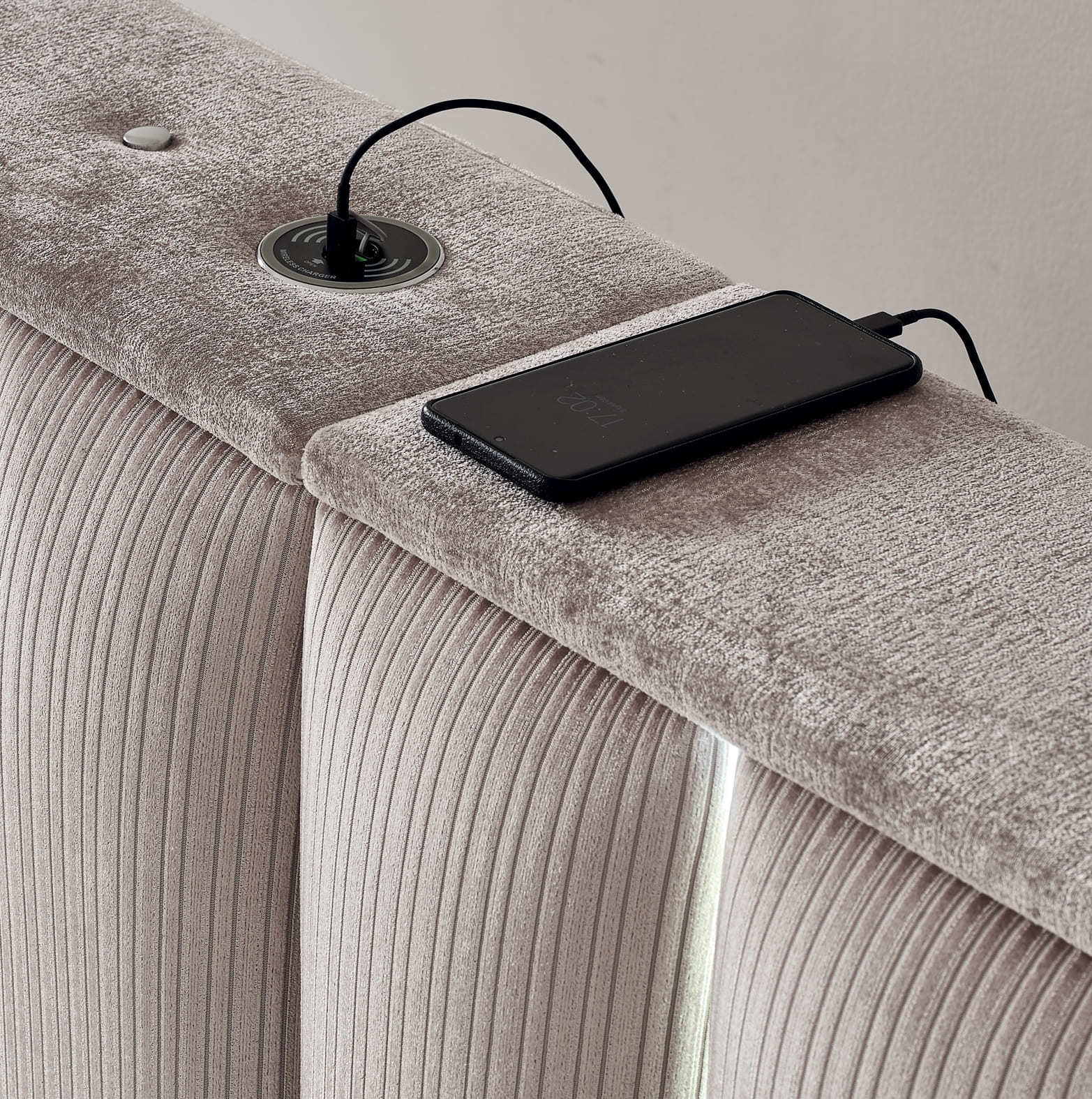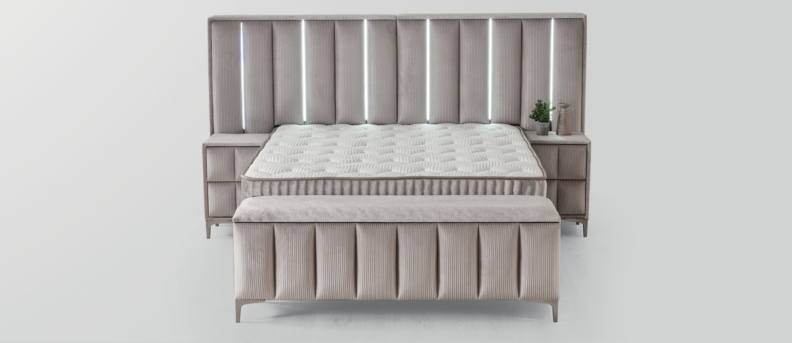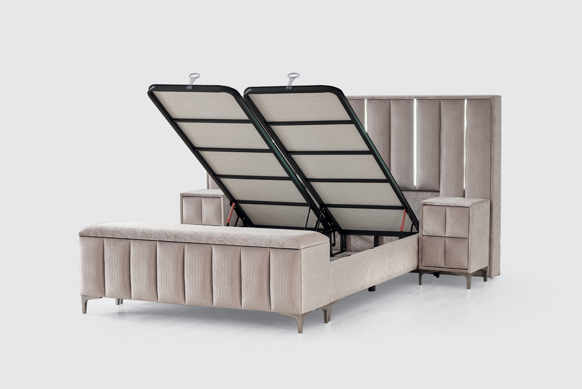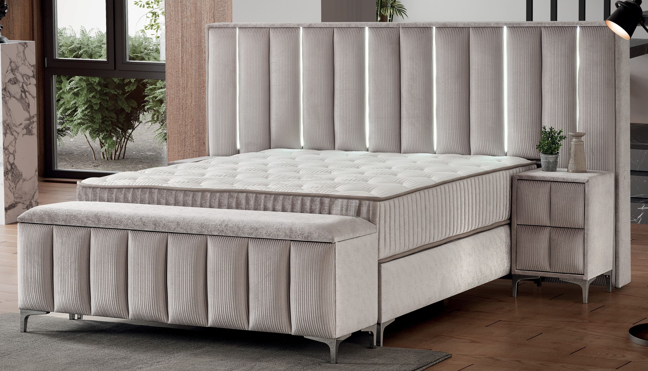 Boxspring ~STARLIGHT~ cu lada de depozitare, saltea premium cu topper inclus, structura metalica, LED-uri si charger USB