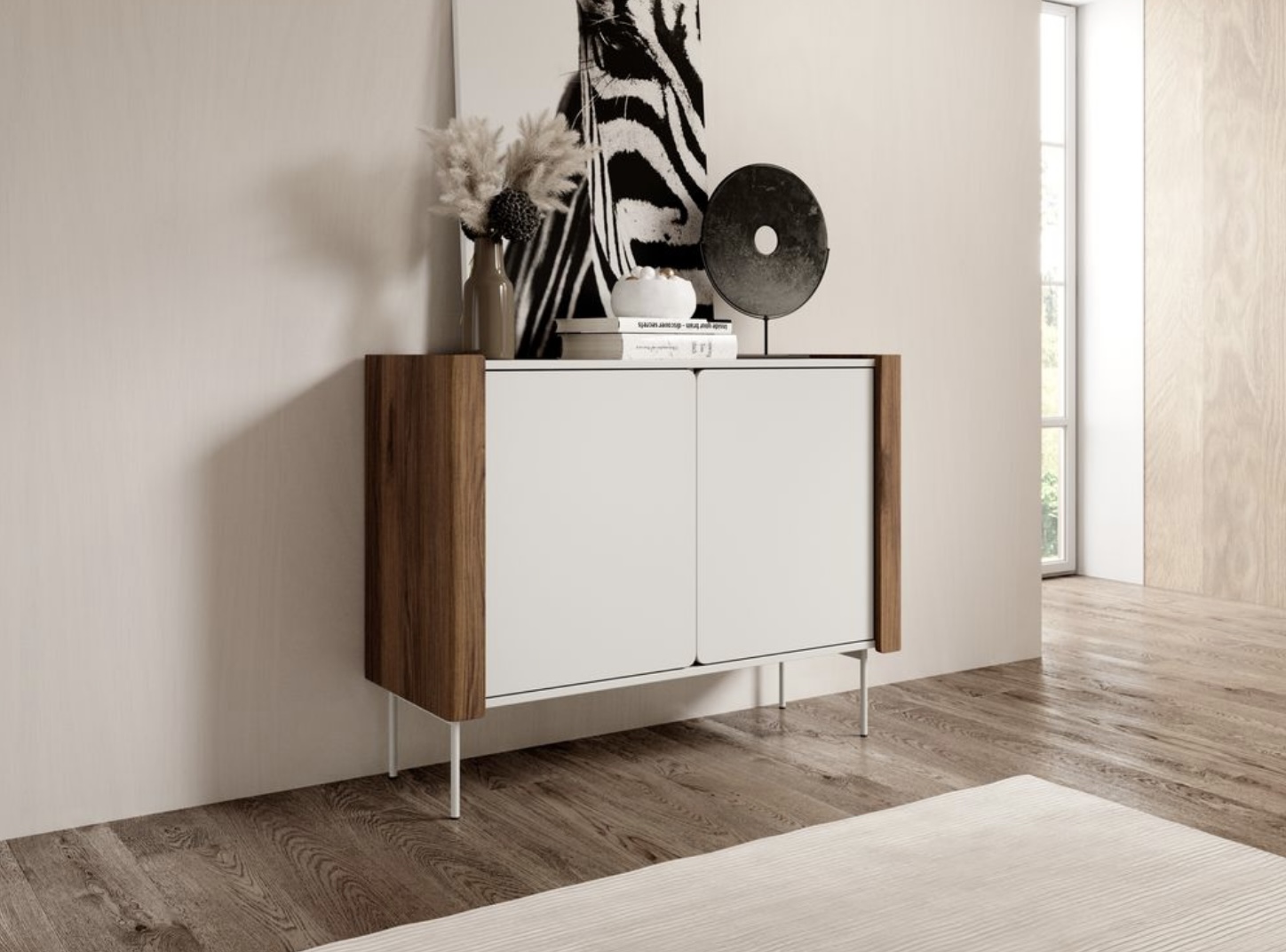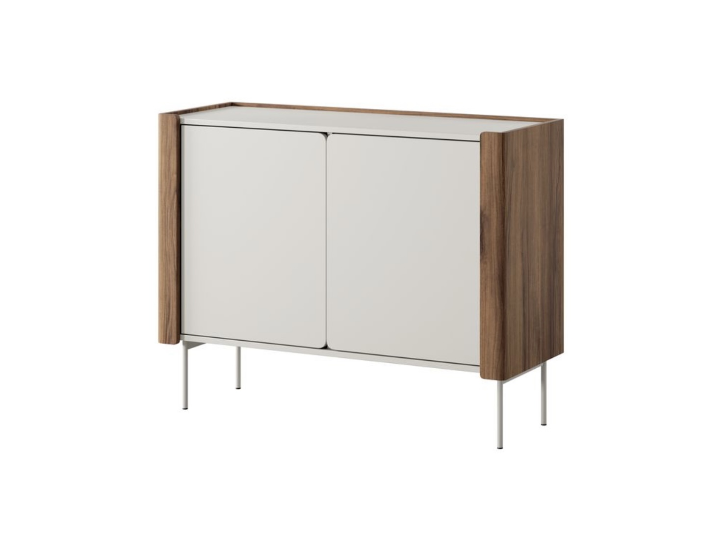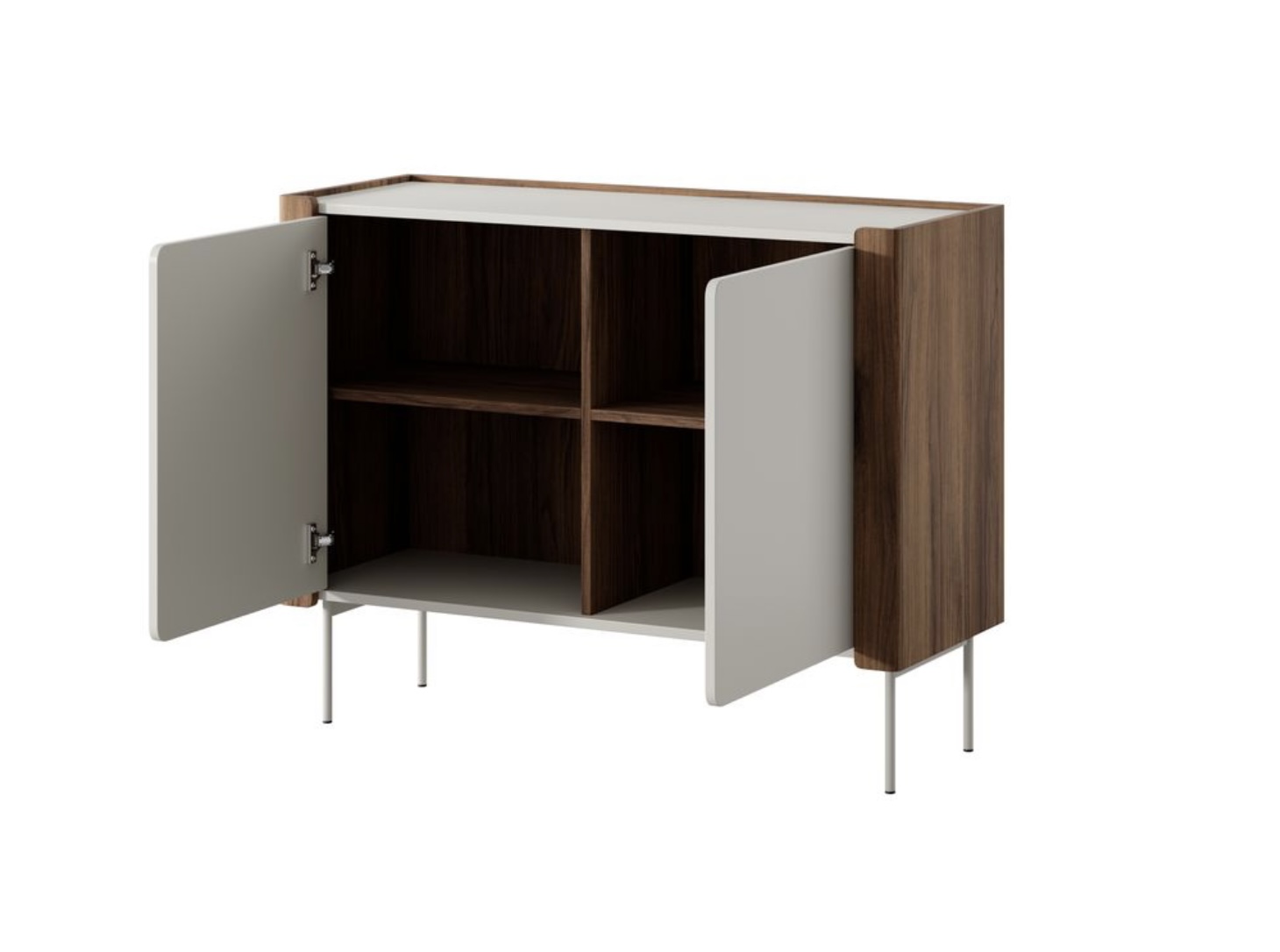 Comodă modernă cu un design elegant și contrast rafinat între nuanța caldă de cashmir și accentele de nuc. Picioarele metalice subțiri și silueta ușor suspendată oferă un aer contemporan și un plus de lejeritate vizuală. Compartimentarea interioară inteligentă cu patru spații de depozitare asigură organizarea eficientă a obiectelor, păstrând în același timp un aspect ordonat.