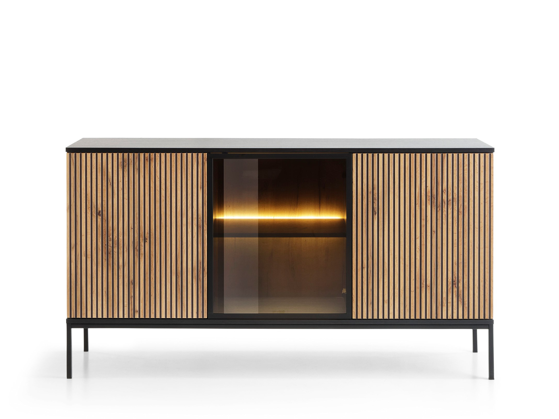 Fabricată din MDF de înaltă calitate, cu fronturi texturate tip stejar și ramă neagră mată, această comodă adaugă personalitate oricărui spațiu. Ușile laterale ascund spații generoase de depozitare, iar secțiunea centrală din sticlă fumurie este iluminată elegant cu bandă LED, perfectă pentru a pune în valoare obiectele decorative.