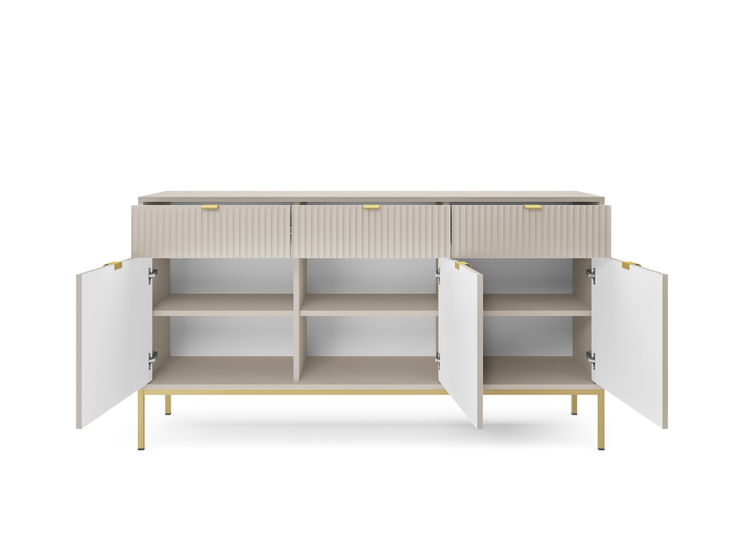 Comodă Premium ~Lusso~ 3 uși, 3 sertare, fronturi MDF canelate, finisaj crem mat, detalii și picioare metalice aurii