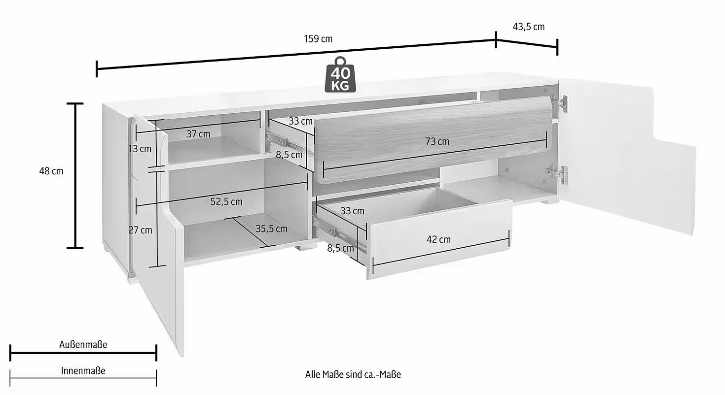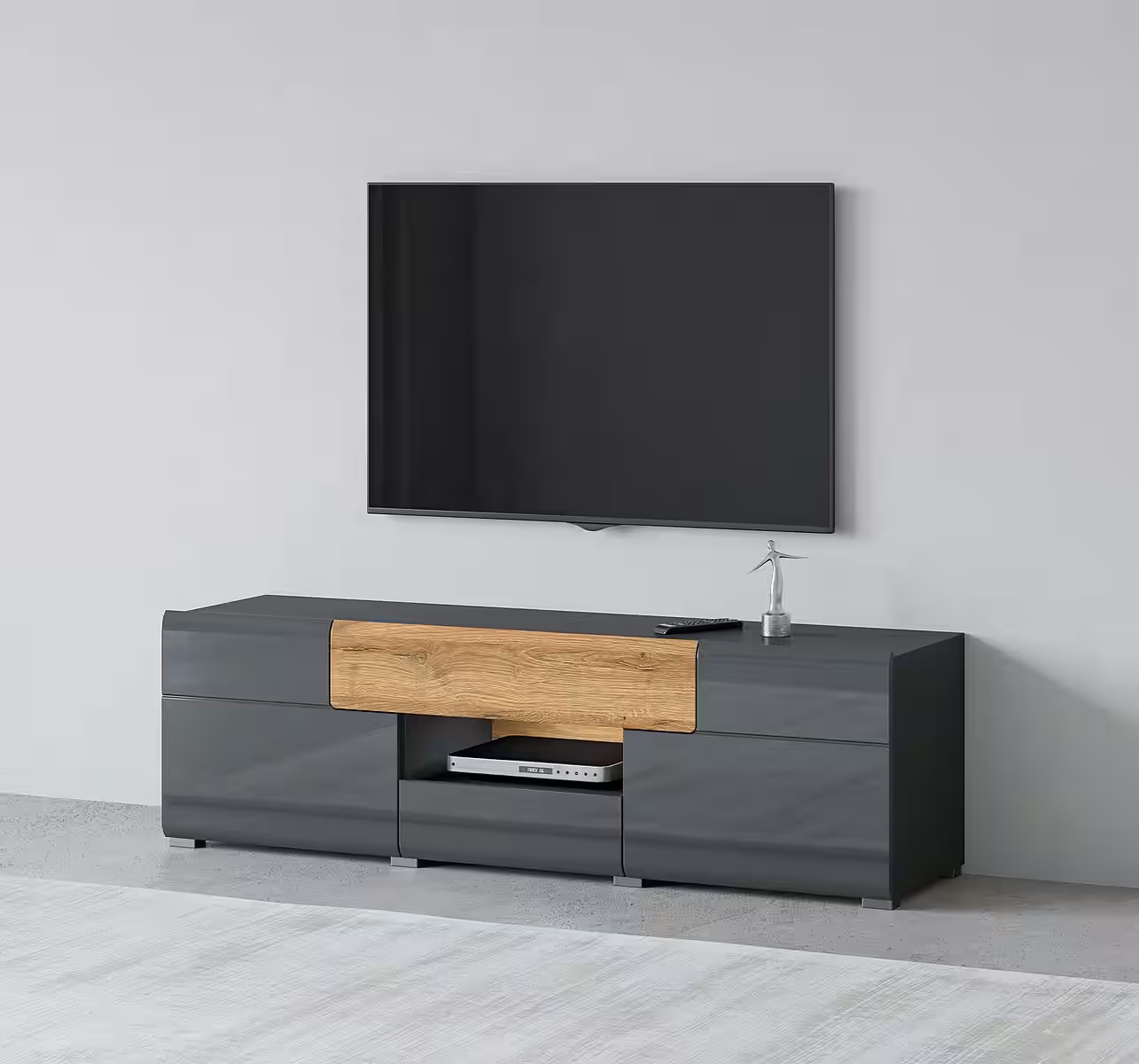 Comodă TV, 2 uși batante, 2 sertare, culoare gri antracit cu stejar, 159 cm lungime