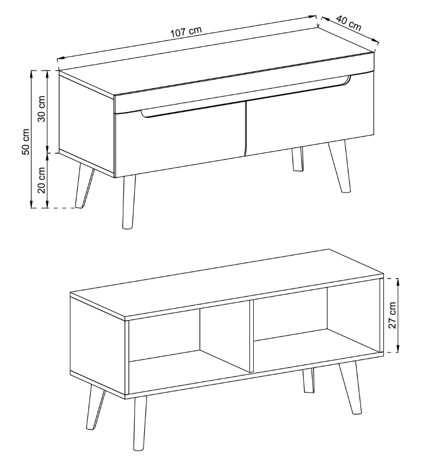 Cu o lățime de 107 cm, este ideală pentru televizoare de dimensiuni medii și oferă spațiu generos de depozitare — perfect pentru accesorii multimedia, telecomenzi, reviste sau obiecte decorative.