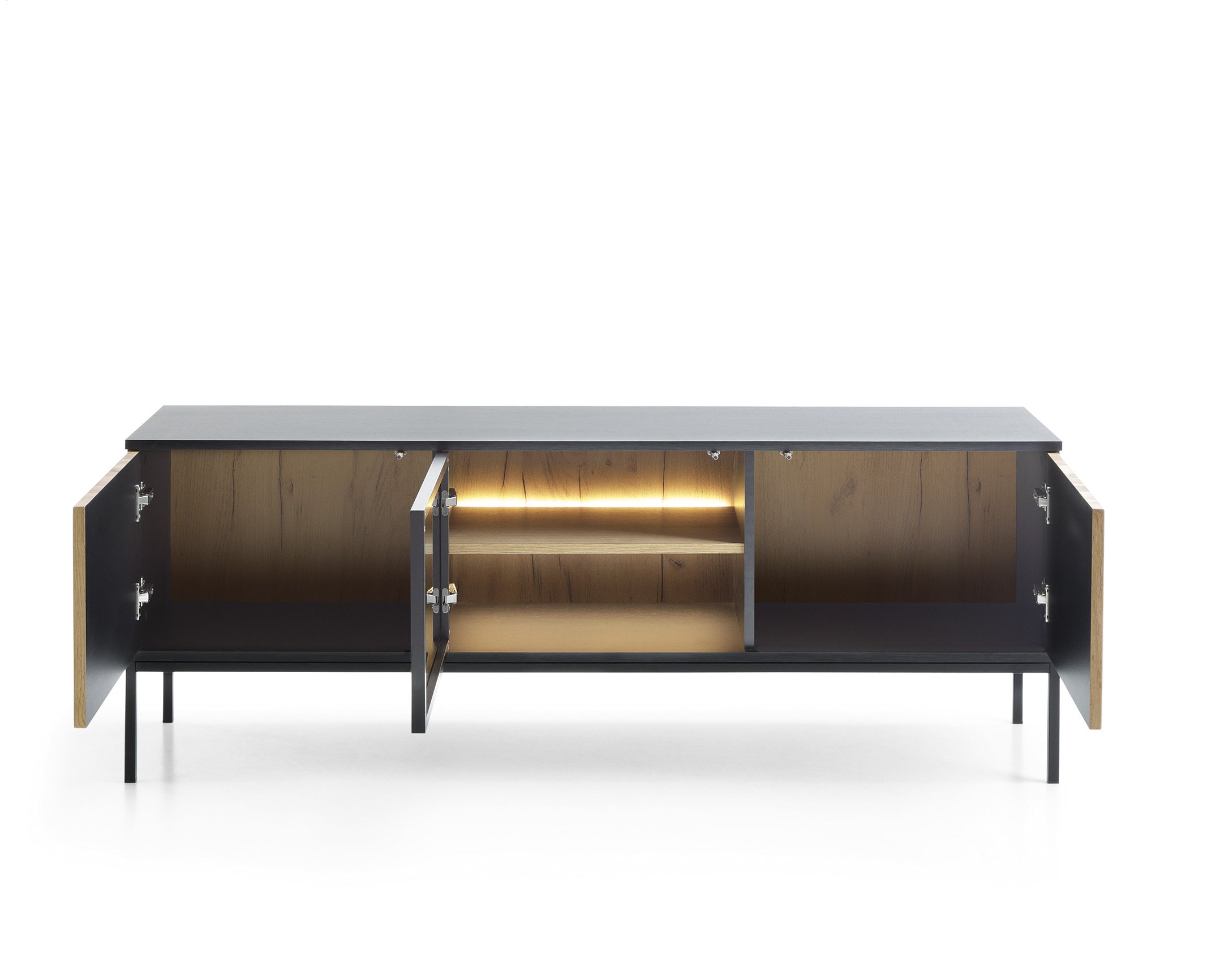 Comodă TV Premium ~Elysée~ fronturi MDF, iluminare LED, sistem push-to-open, finisaj negru cu stejar, picioare negru mat