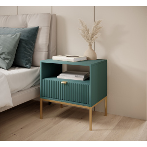Cu fronturi canelate din MDF și un finisaj verde smarald mat, comoda emană un aer modern și exclusivist. Cadrul și picioarele metalice aurii adaugă o notă de lux subtil, creând un contrast spectaculos cu tonul profund al mobilierului.