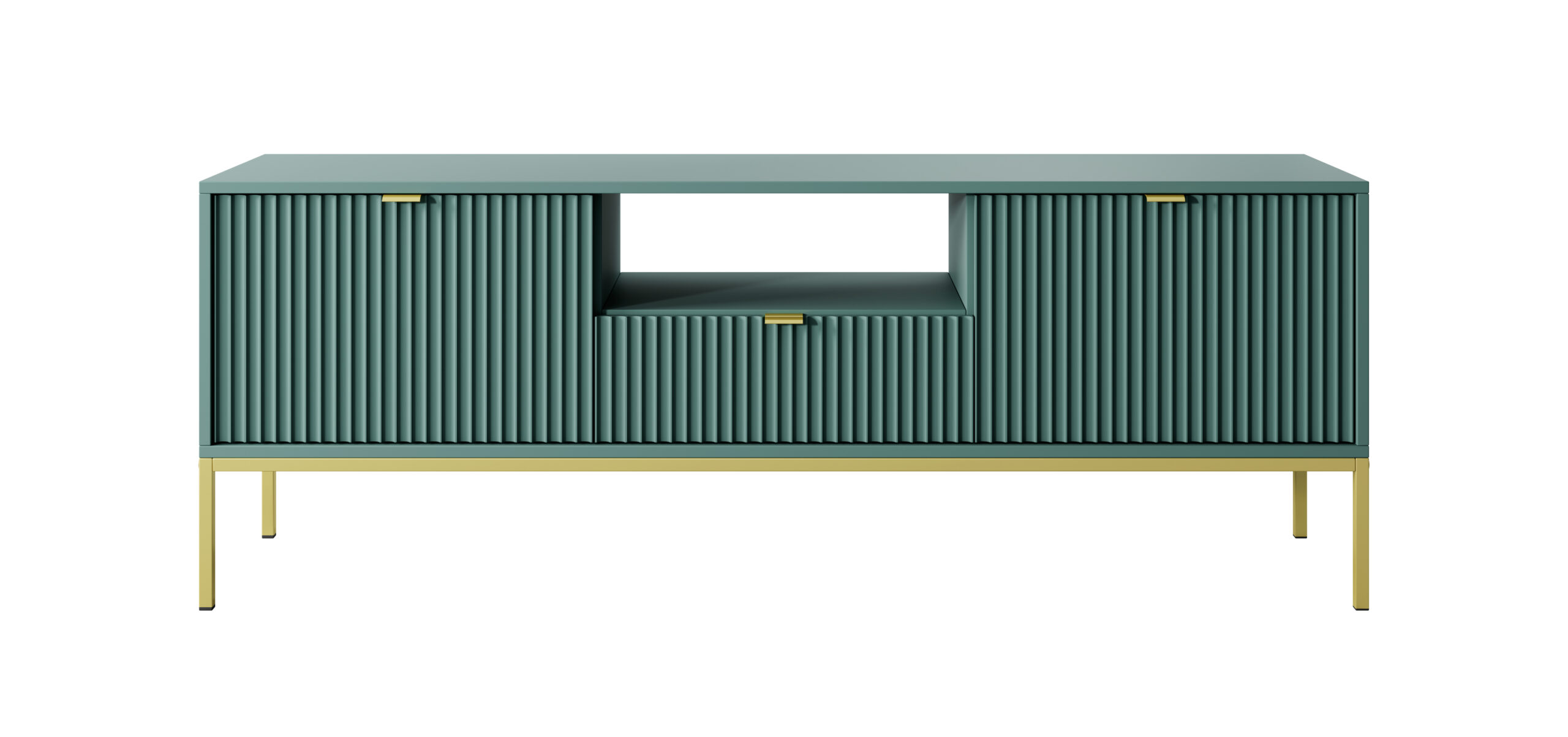 Comodă TV Premium ~Lusso~ 1 sertar și 2 uși, fronturi MDF canelate, finisaj verde smarald, cadru și picioare metalice aurii