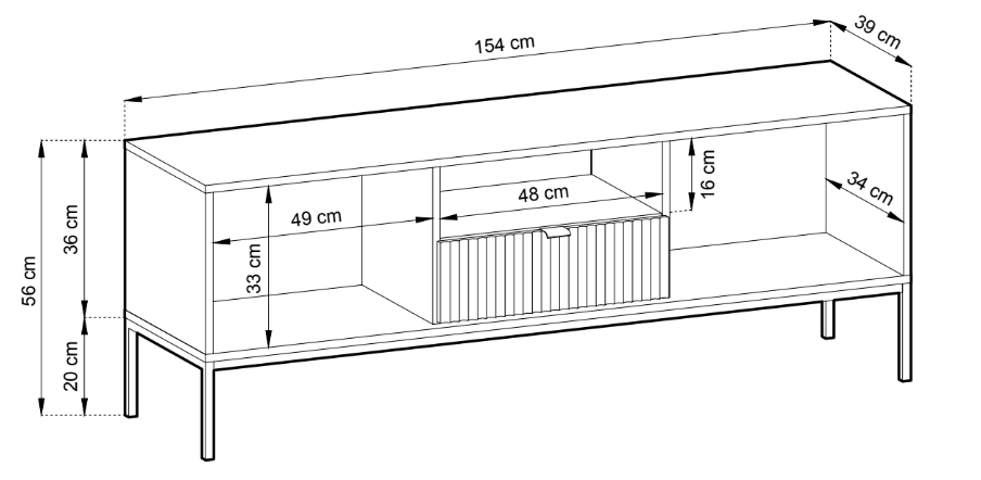 Cele două uși laterale oferă spațiu generos pentru depozitare, iar sertarul central și raftul deschis permit organizarea echipamentelor media, consolelor sau accesoriilor decorative.