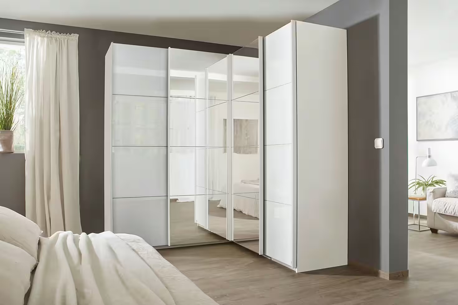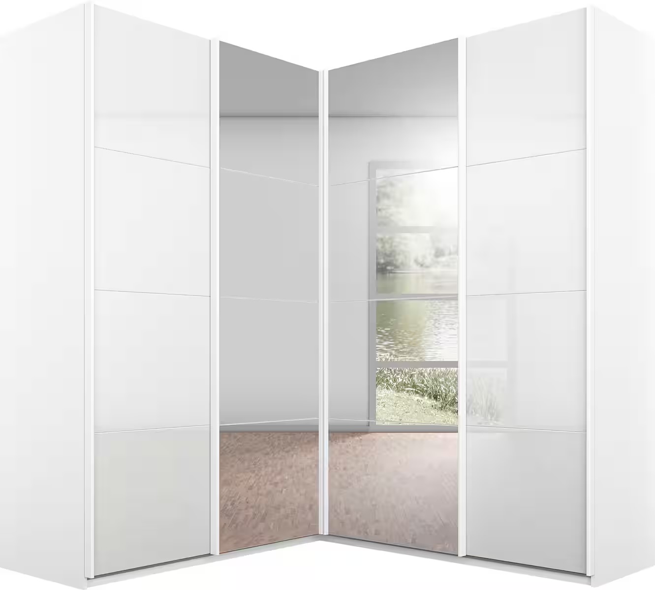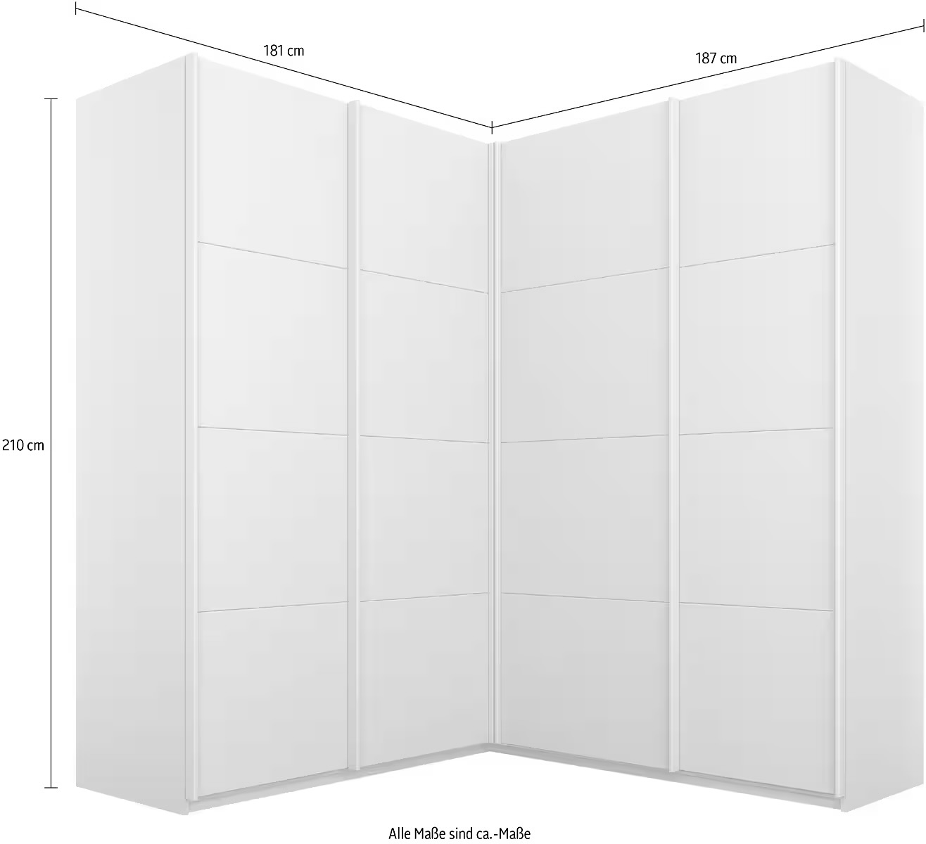 Dressing 181/181 cm, 4 uși glisante, fronturi sticlă, oglindă pe mijloc, culoare alb, compartimentare premium, 210 cm înălțime