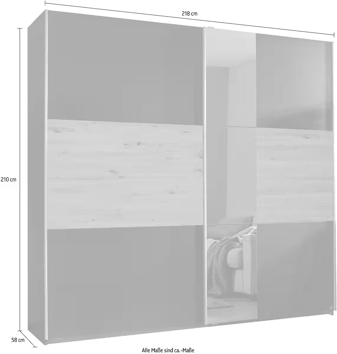 Dressing 218 cm lungime, 2 uși glisante, culoare alb, oglindă pe mijloc, 210 cm înălțime
