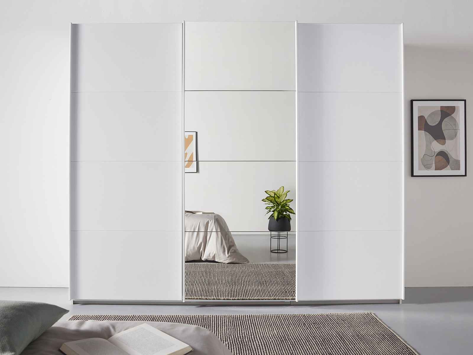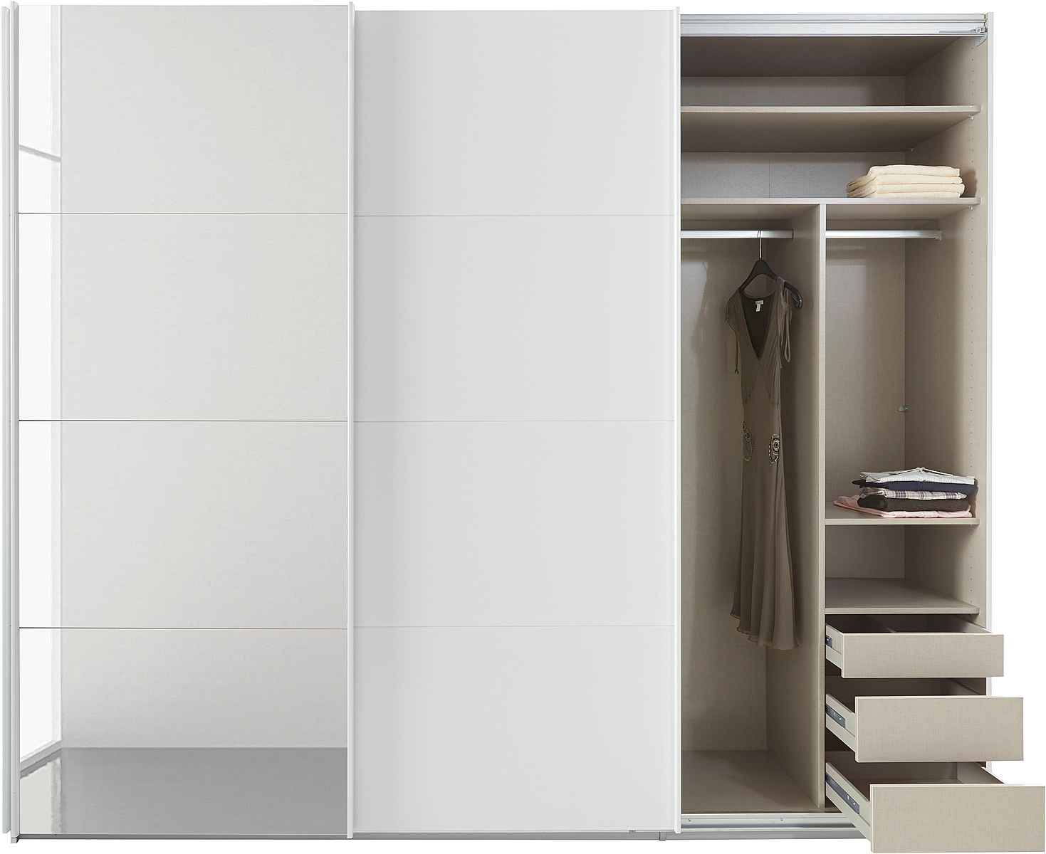 Dulapul cu uși glisante de la rauch cu dotări interioare extinse vă oferă mult spațiu de depozitare și asigură ordine în casa dumneavoastră. Datorită designului său modern și a unei selecții atractive de culori, puteți integra dulapul în orice stil interior. O oglindă mare din partea din față a dulapului arată elegantă și creează spațiu vizual în cameră.