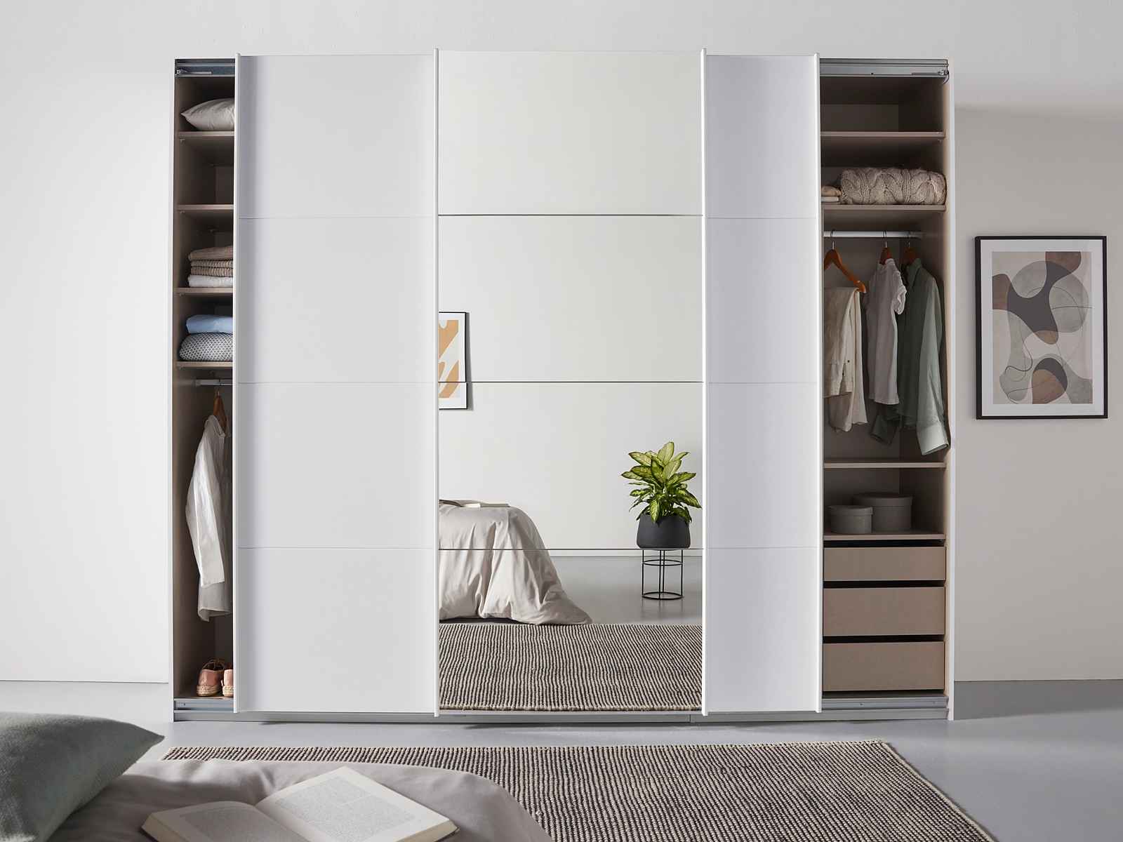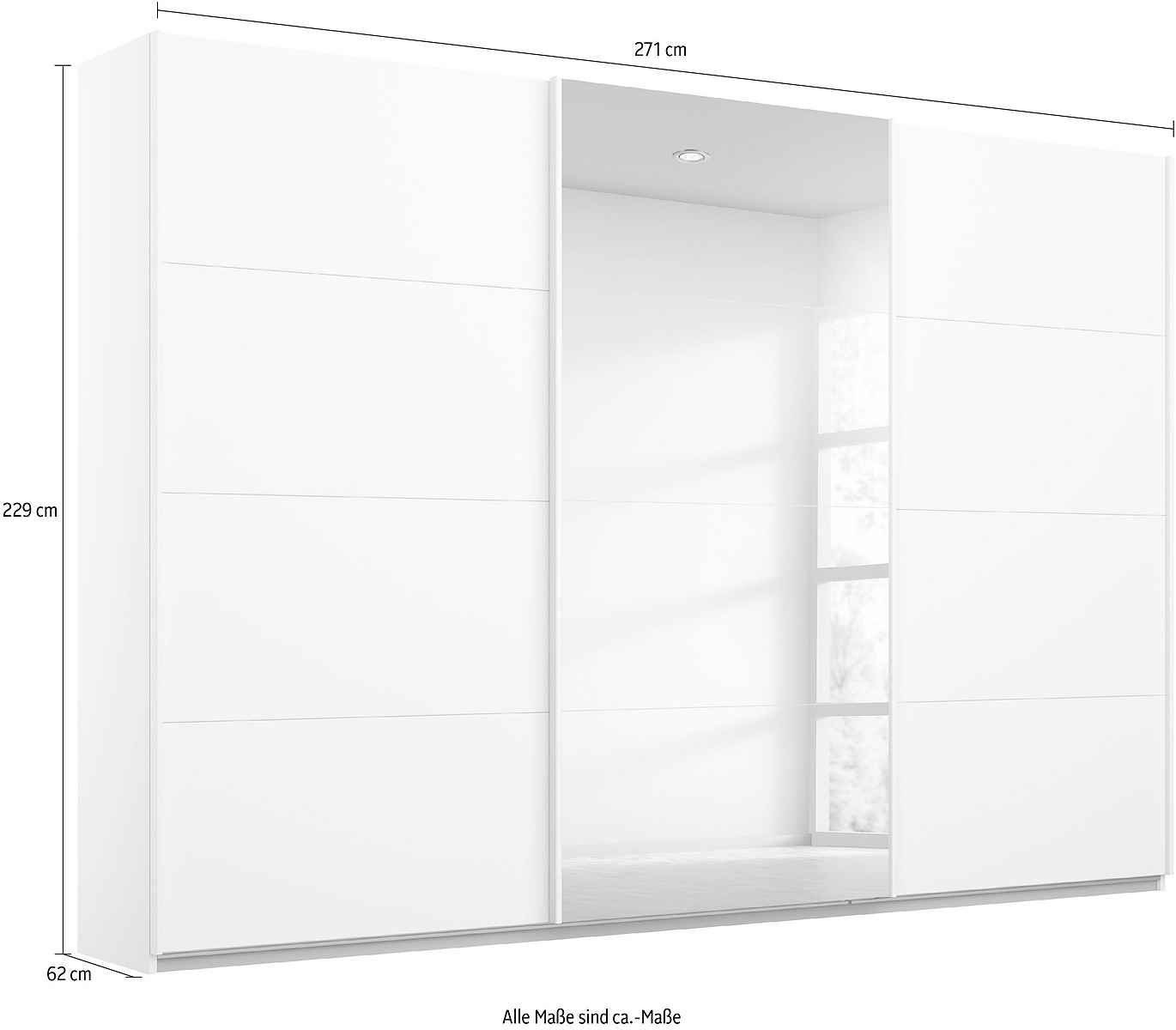 Dressing 271 cm, 3 uși glisante, oglinda pe mijloc, culoare alb, compartimentare premium, 230 cm înălțime