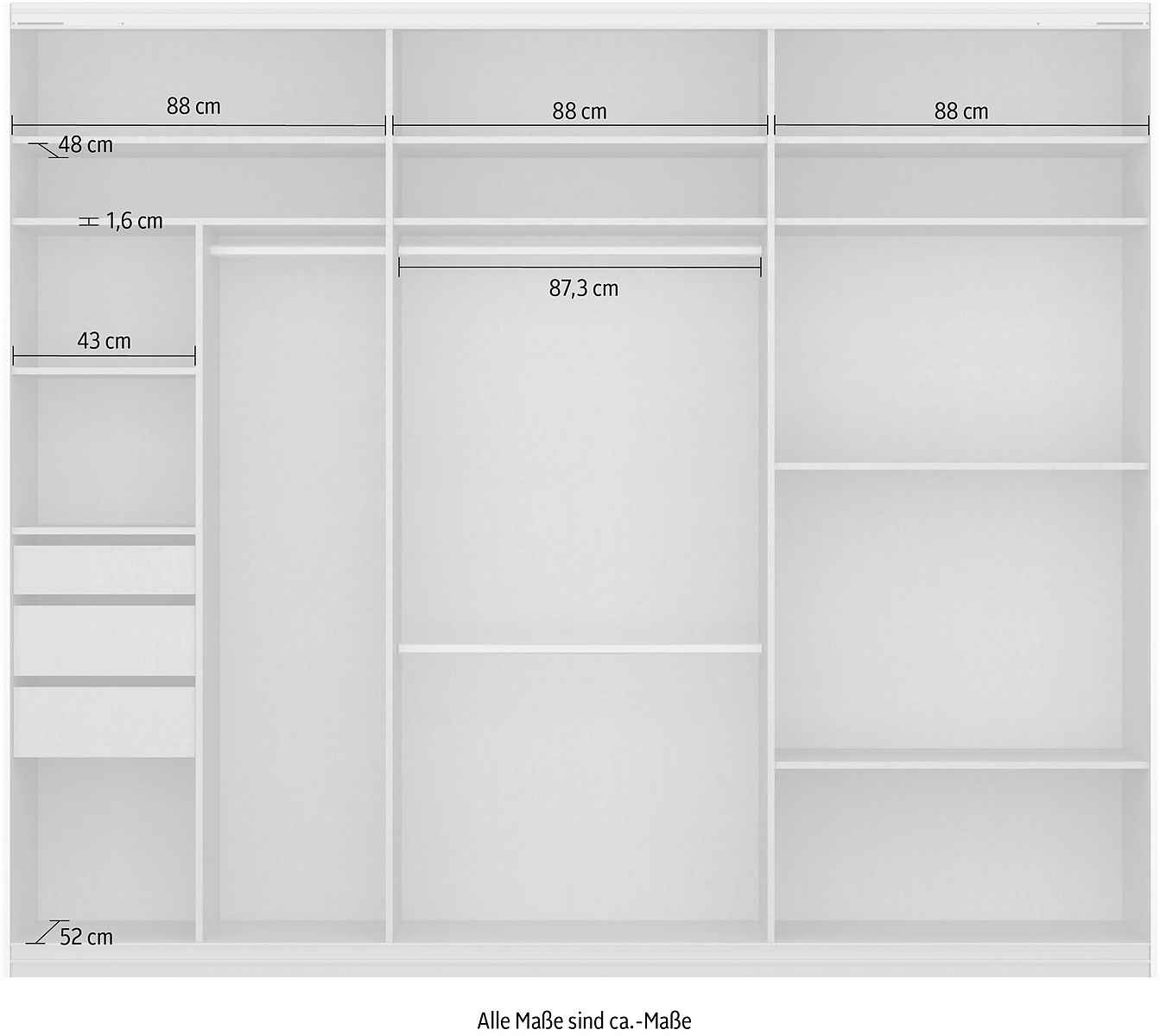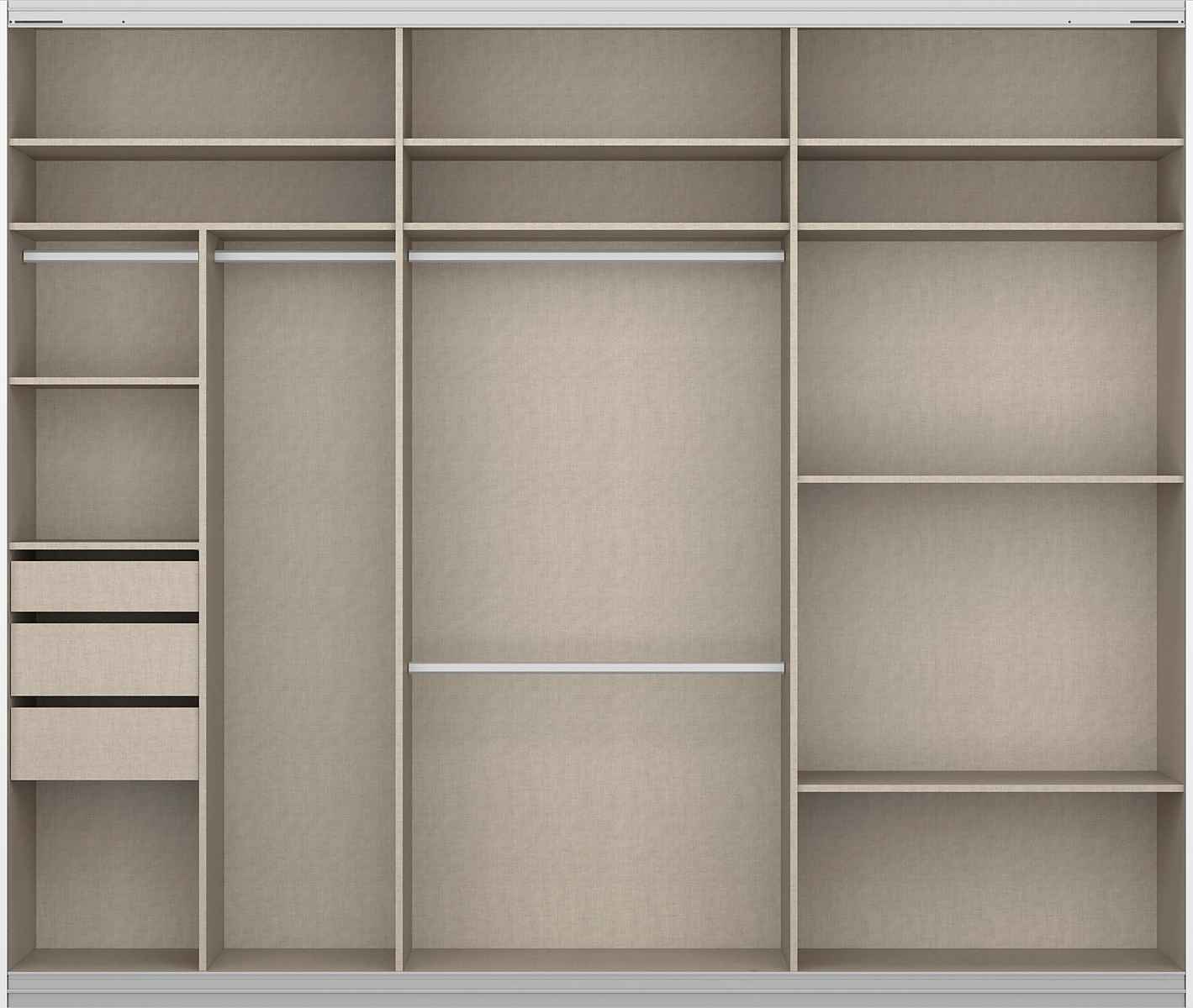 Deschideți și închideți cele trei uși glisante mari cu benzi metalice de mâner care se potrivesc vizual cu designul. Ușile glisează în lateral pentru a economisi spațiu și în liniște, dezvăluind interiorul spațios al dulapului. Designul interior bine gândit vă ajută să utilizați perfect fiecare centimetru din interiorul dulapului. Diviziunea interioară practică cu 2 rafturi înguste este completată de 3 sertare interioare. Aceste sertare pot fi montate la înălțimi variabile și pot depozita șosete, rufe, etc. Două rafturi largi suplimentare oferă spațiu suplimentar de depozitare.