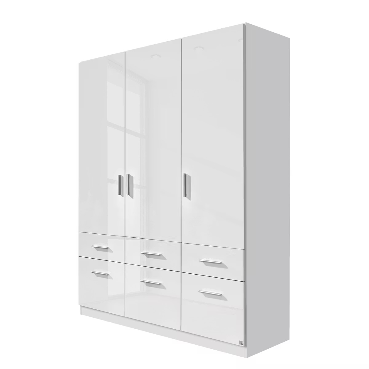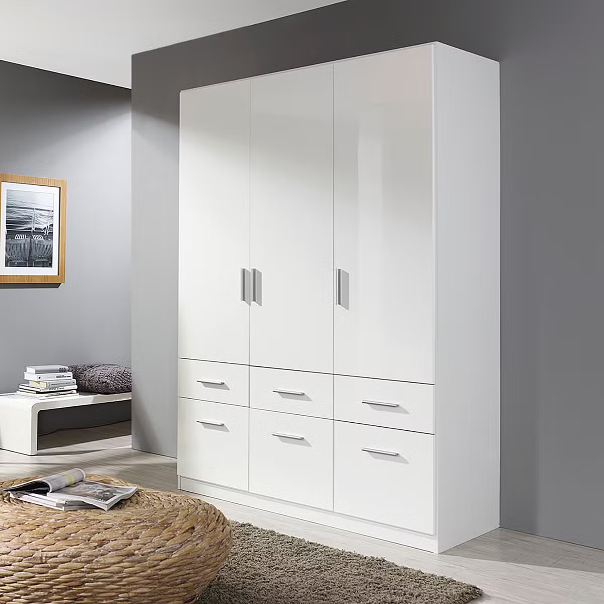Dulap 137 cm lungime, 3 uși batante, 6 sertare, fronturi alb lucios, corp alb, 210 cm înălțime