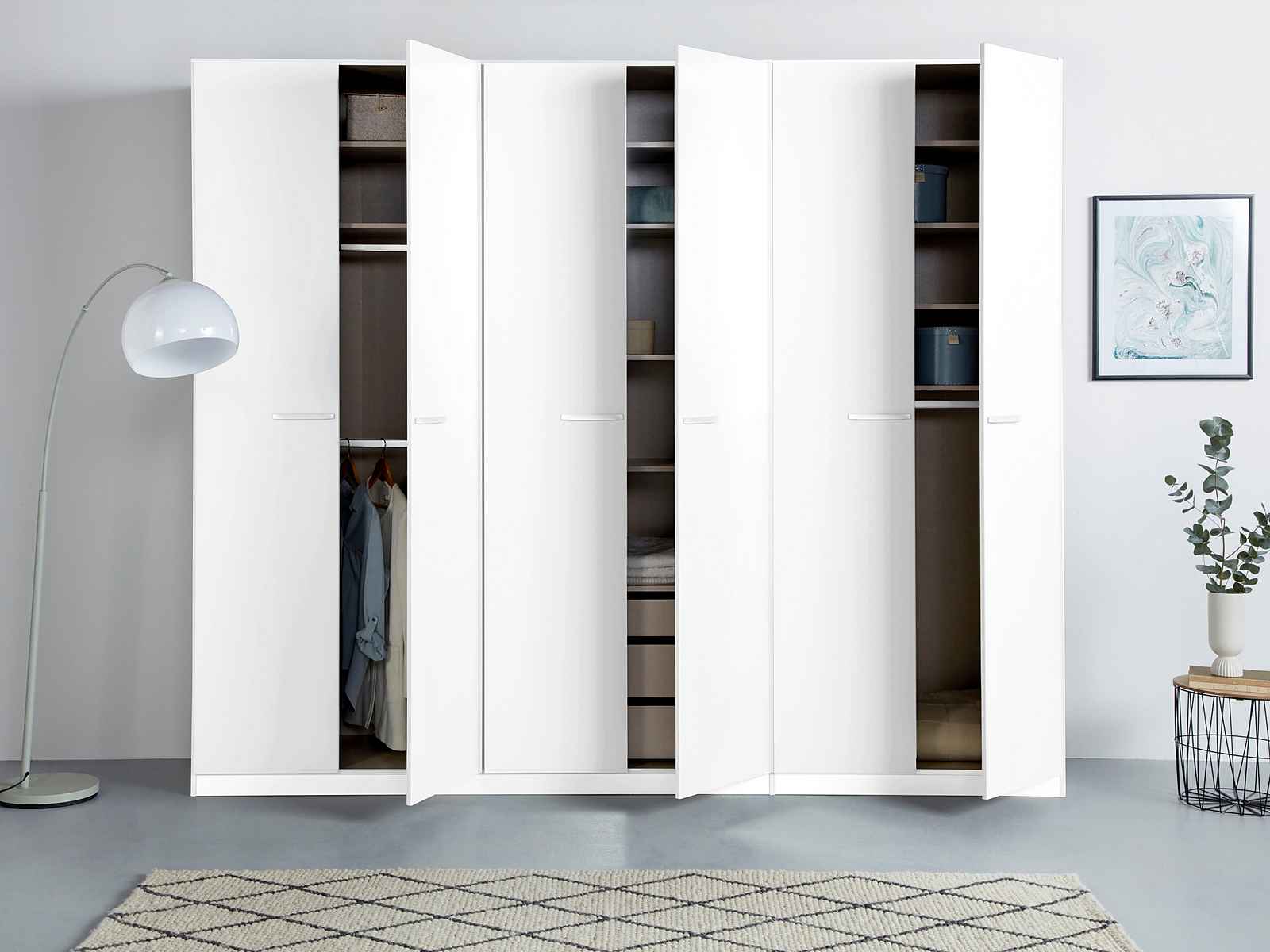 Dulapul cu ușă rotativă de la rauch cu dotări interioare extinse vă oferă mult spațiu de depozitare și asigură ordine în casa dumneavoastră. Datorită designului său modern și a unei selecții atractive de culori, puteți integra dulapul în orice stil interior. Deschideți ușile rotative cu mânere metalice transversale care se potrivesc cu culoarea designului. Mânerele bine modelate devin punctul culminant vizual al dulapului. Designul interior bine gândit vă ajută să utilizați perfect fiecare centimetru din interiorul dulapului. Diviziunea interioară practică cu 2 rafturi înguste este completată de 3 sertare interioare.