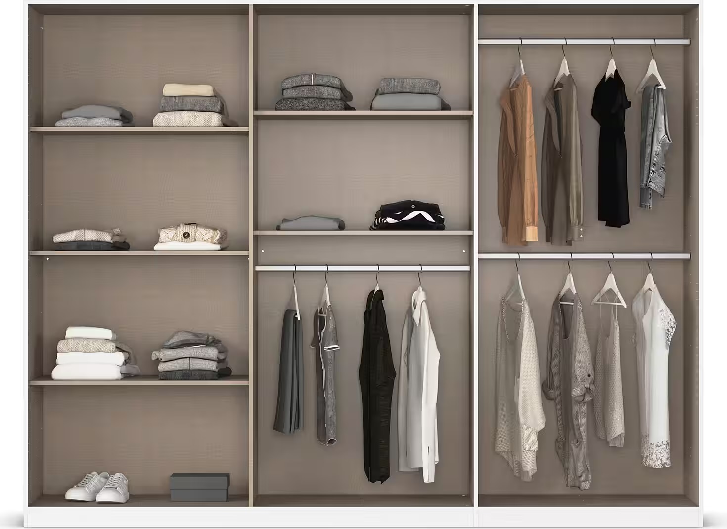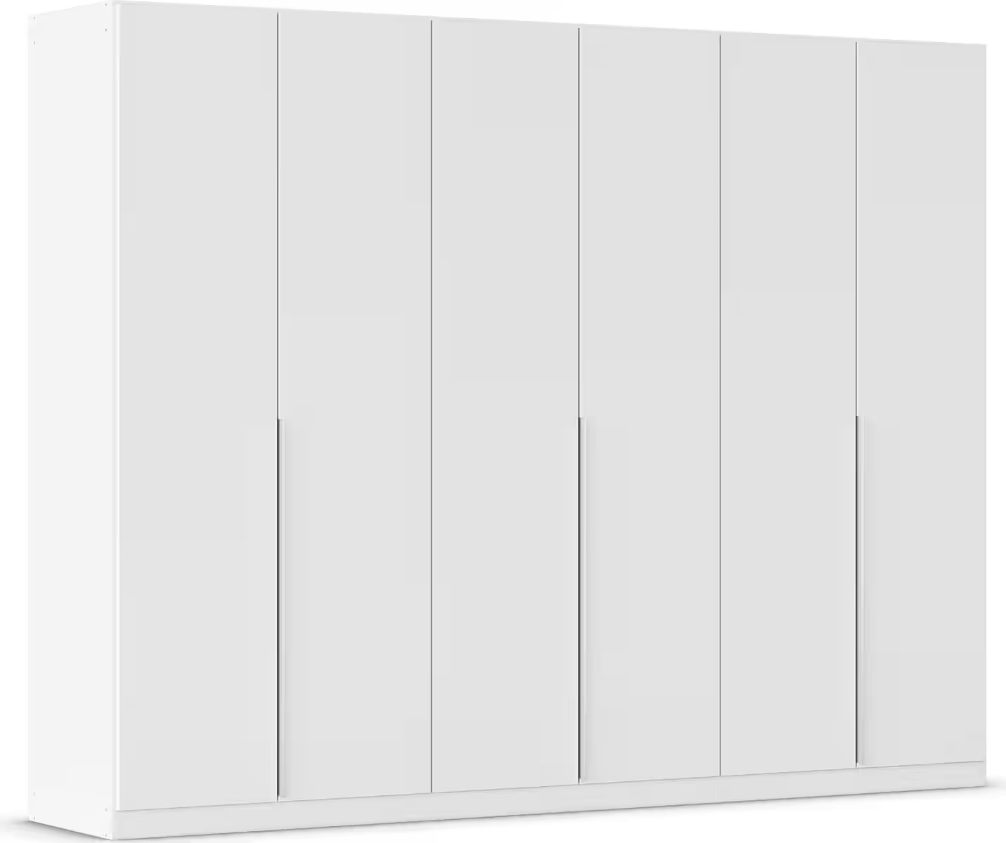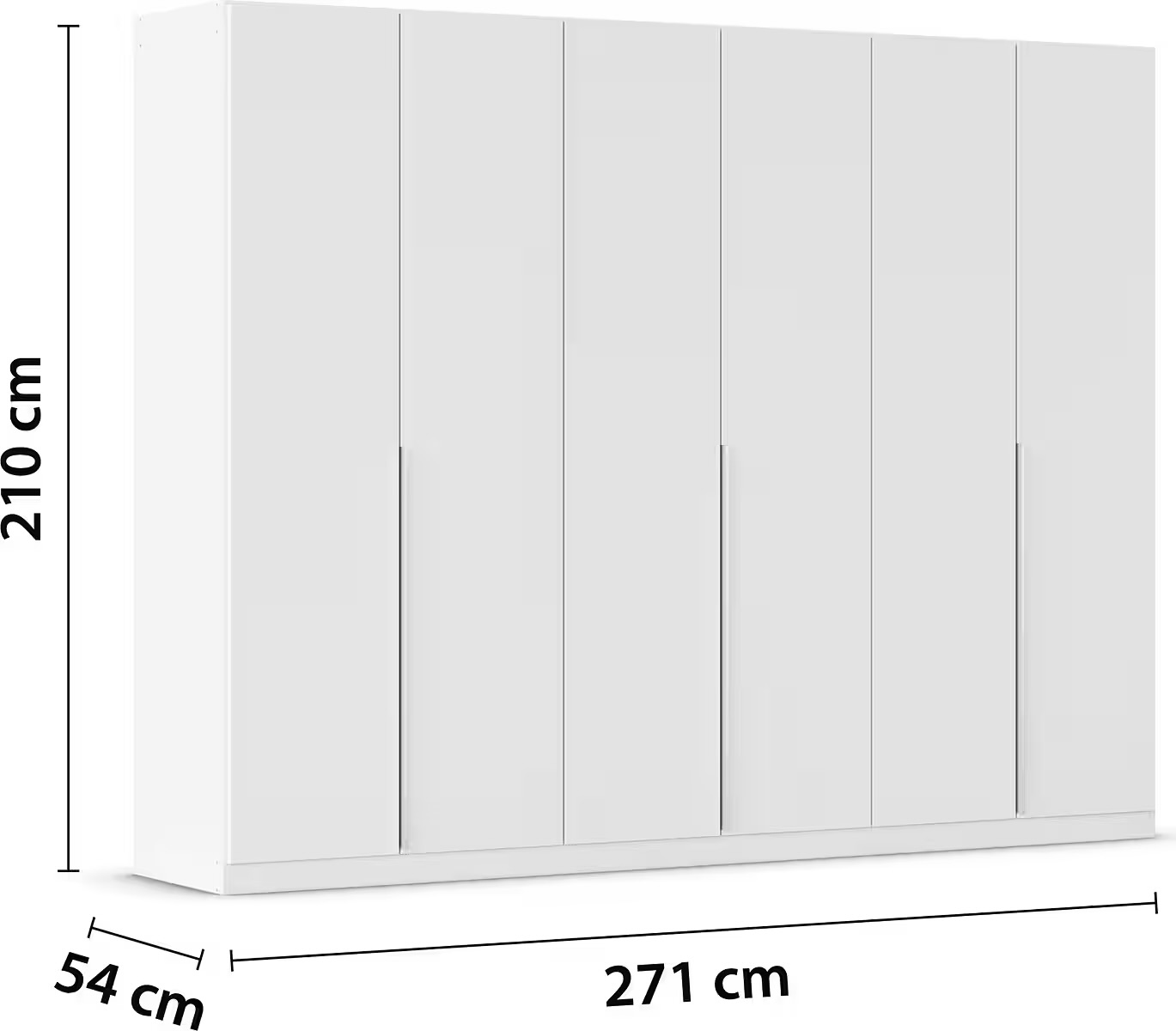 Dulap 271 cm lungime, 6 uși batante, culoare alb, mânere argintii, 210 cm înălțime