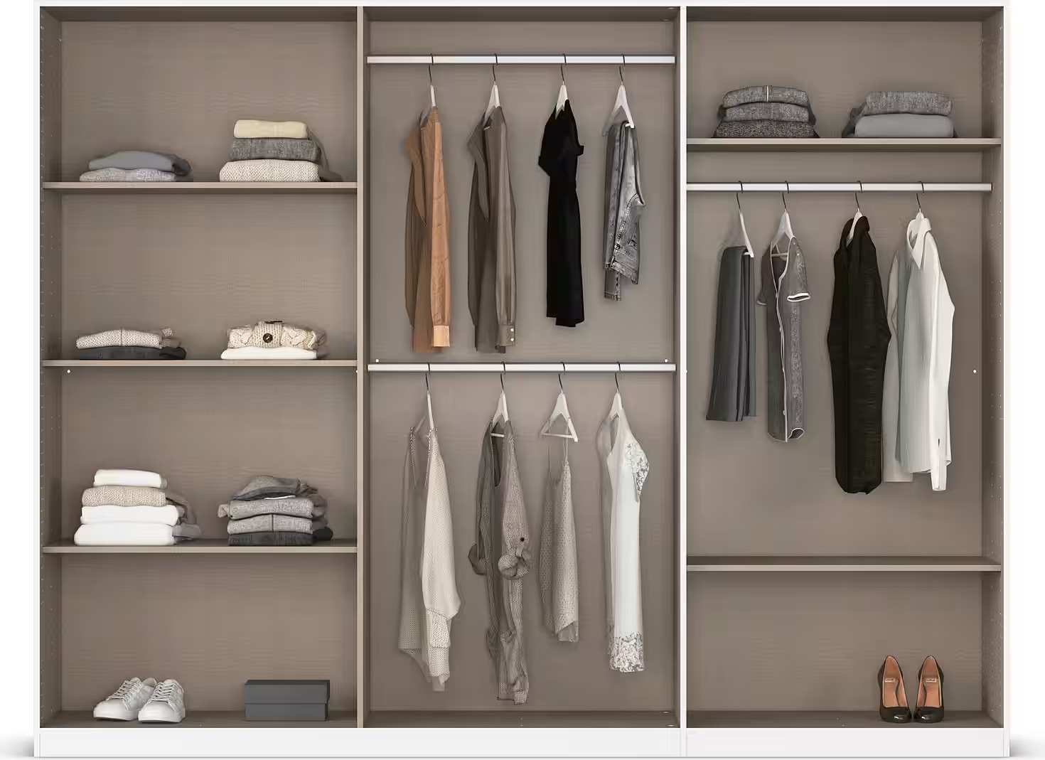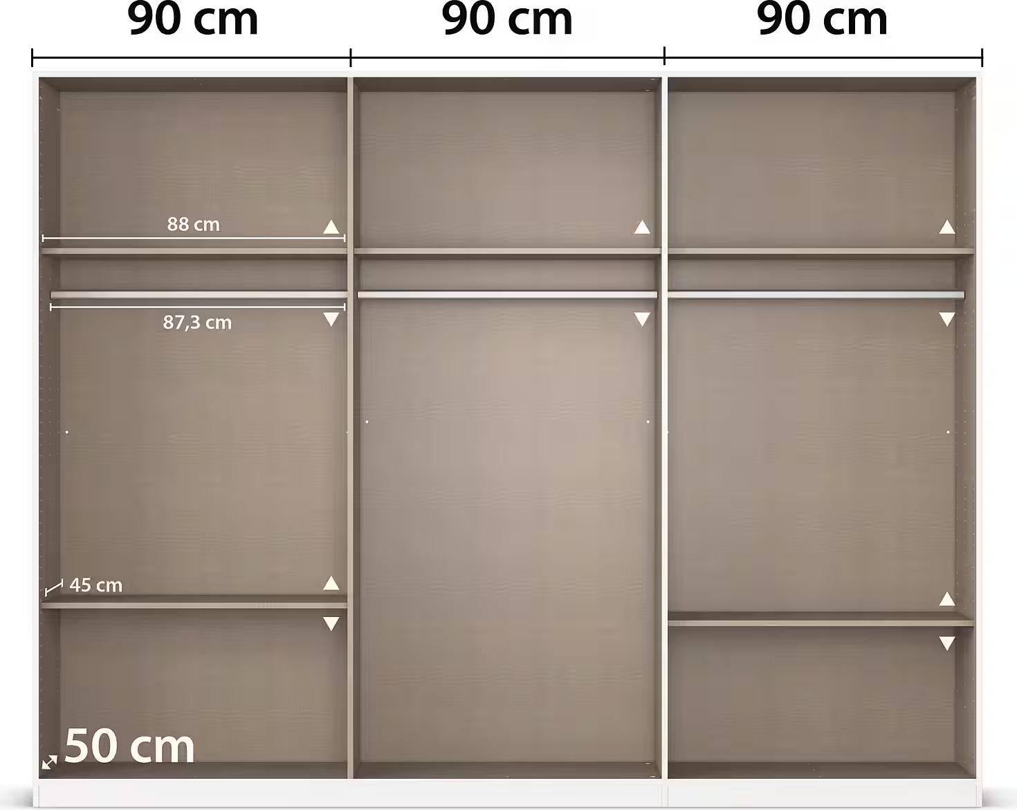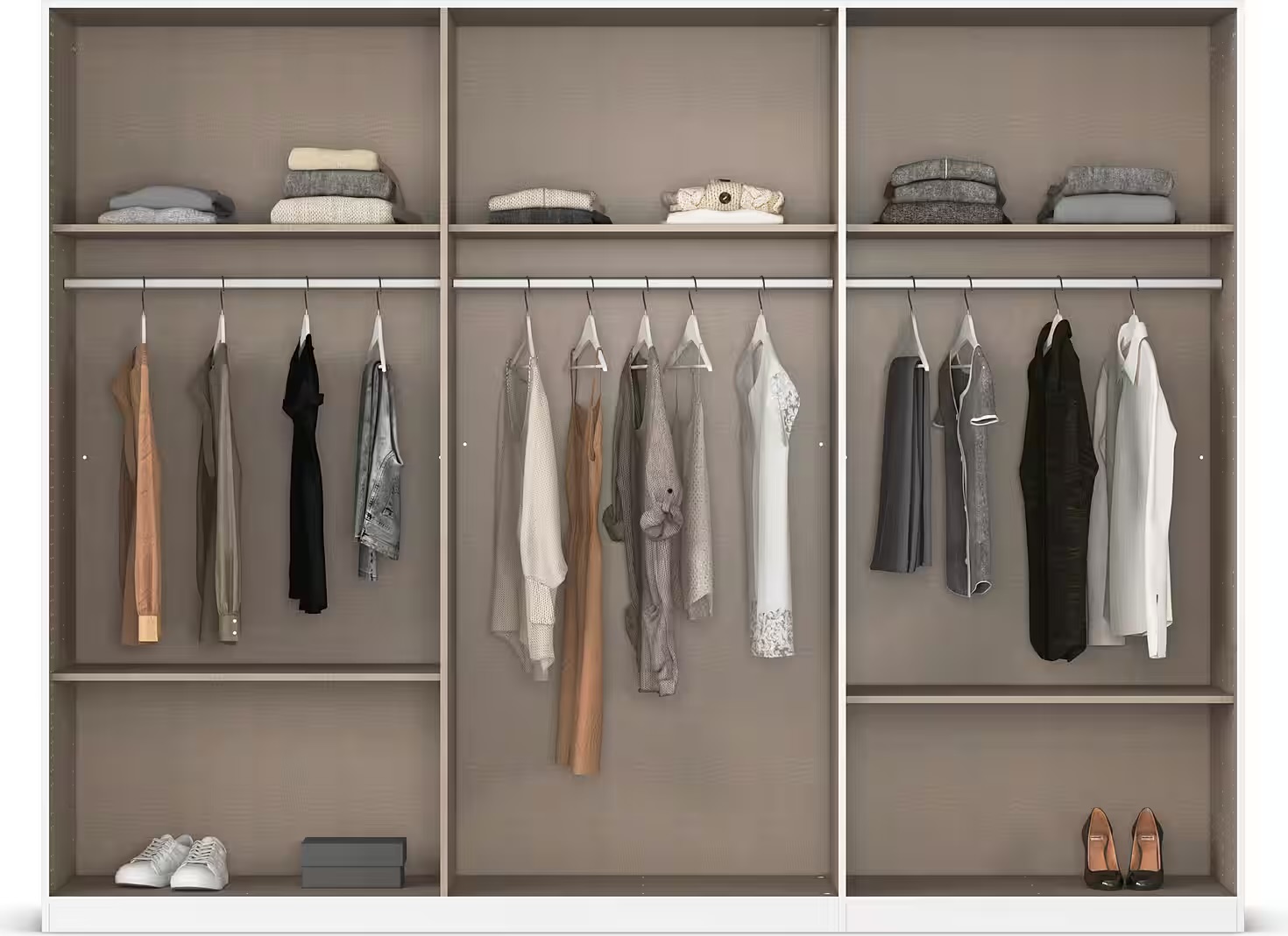 Dulap 271 cm lungime, 6 uși batante, culoare alb, mânere argintii, 210 cm înălțime