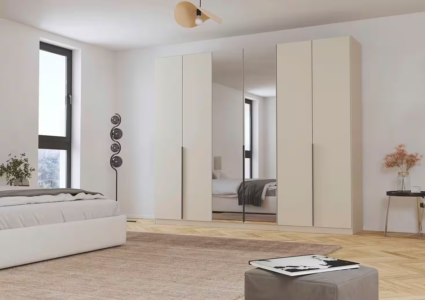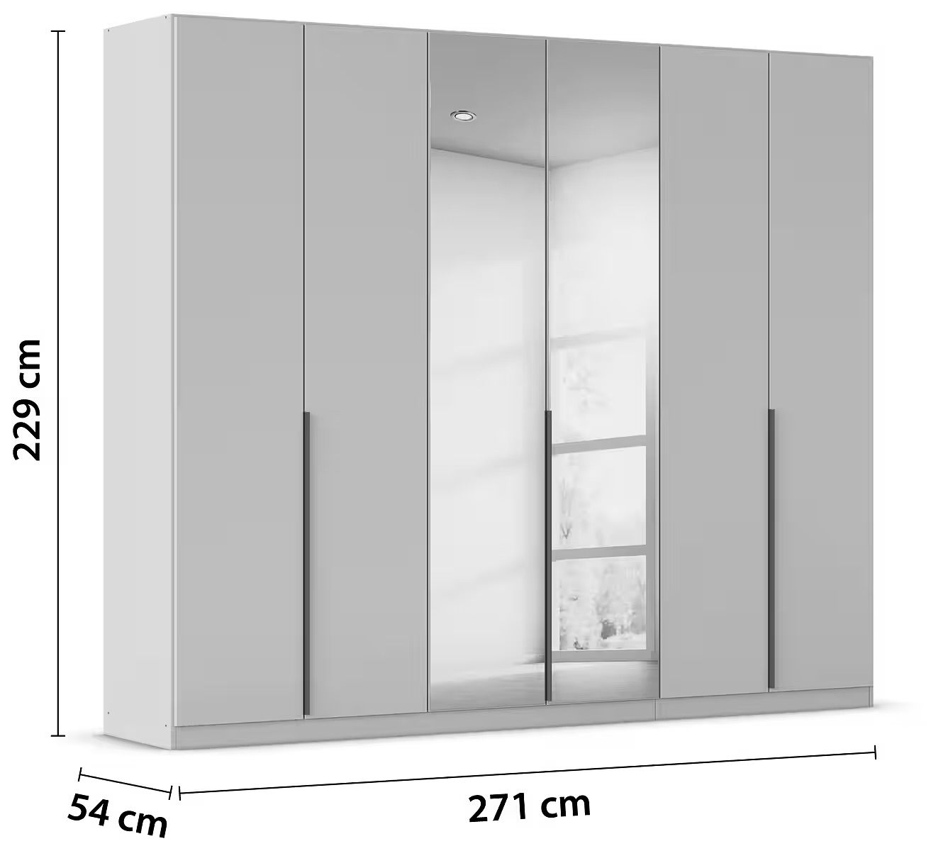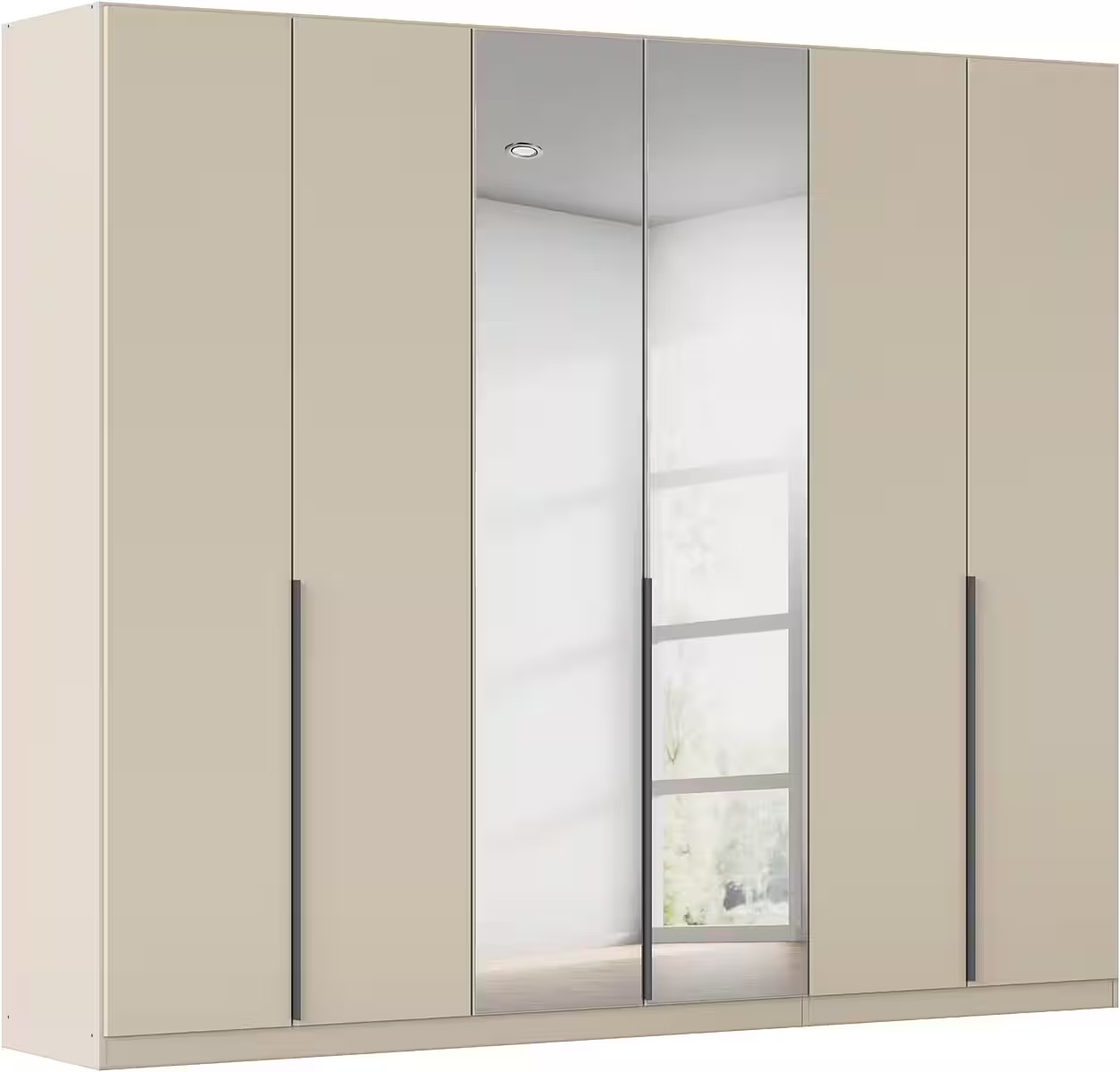 Dulap 271 cm lungime, 6 uși batante, oglindă pe mijloc, culoare cașmir, mânere negru mat, 229 cm înălțime