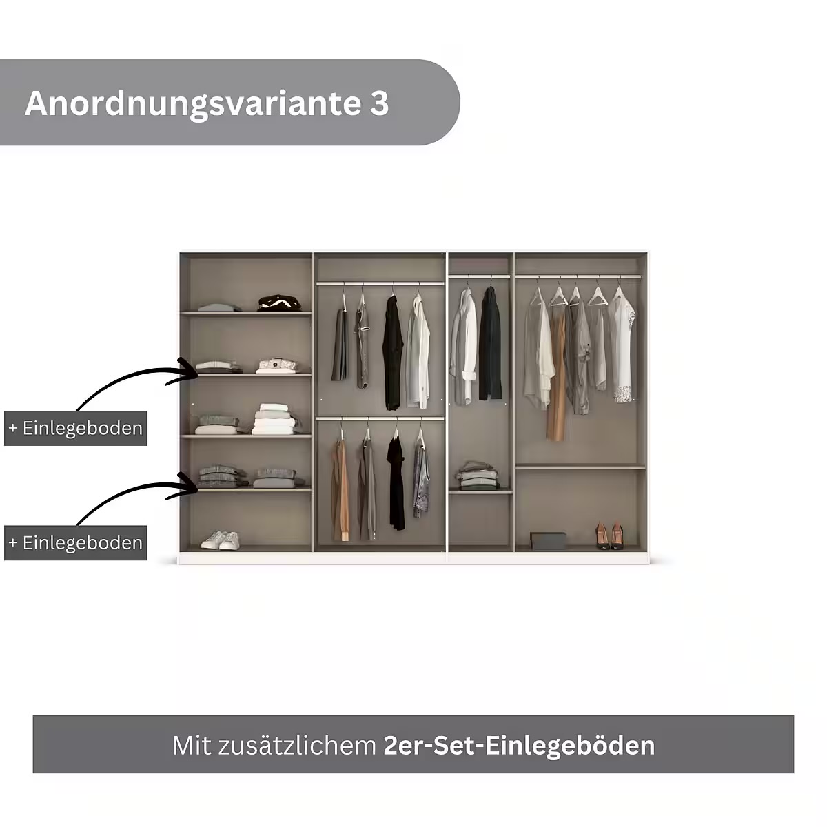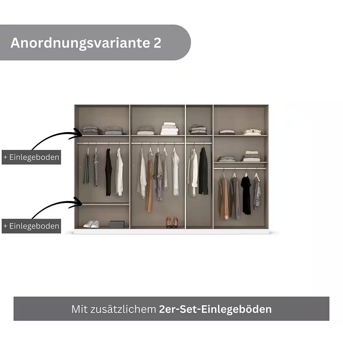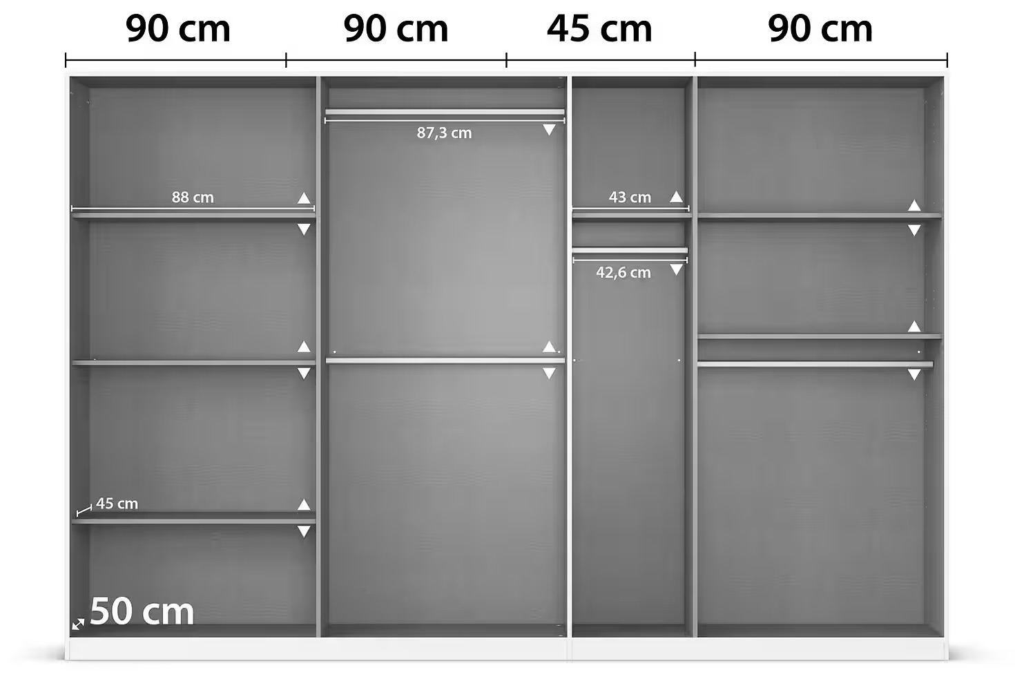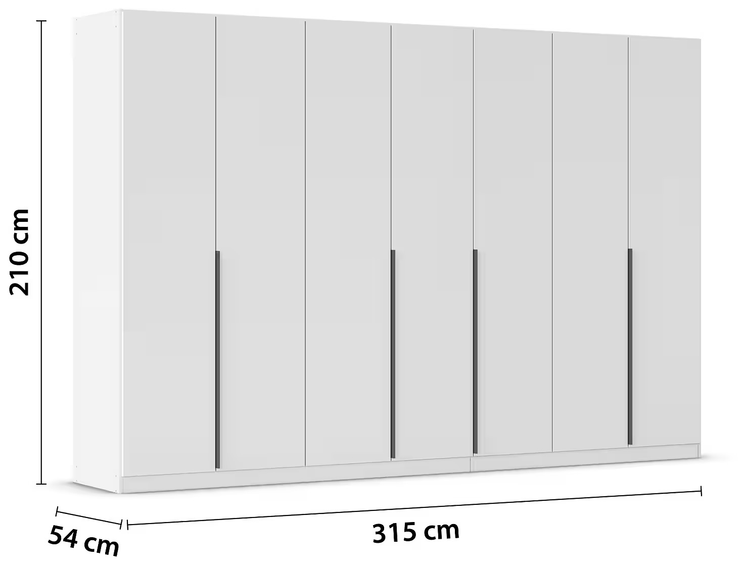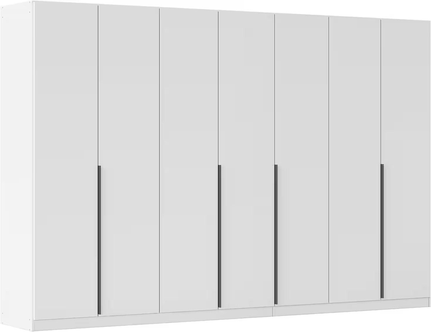 Dulap 315 cm lungime, 7 uși batante, culoare alb, mânere negre mat, 210 cm înălțime