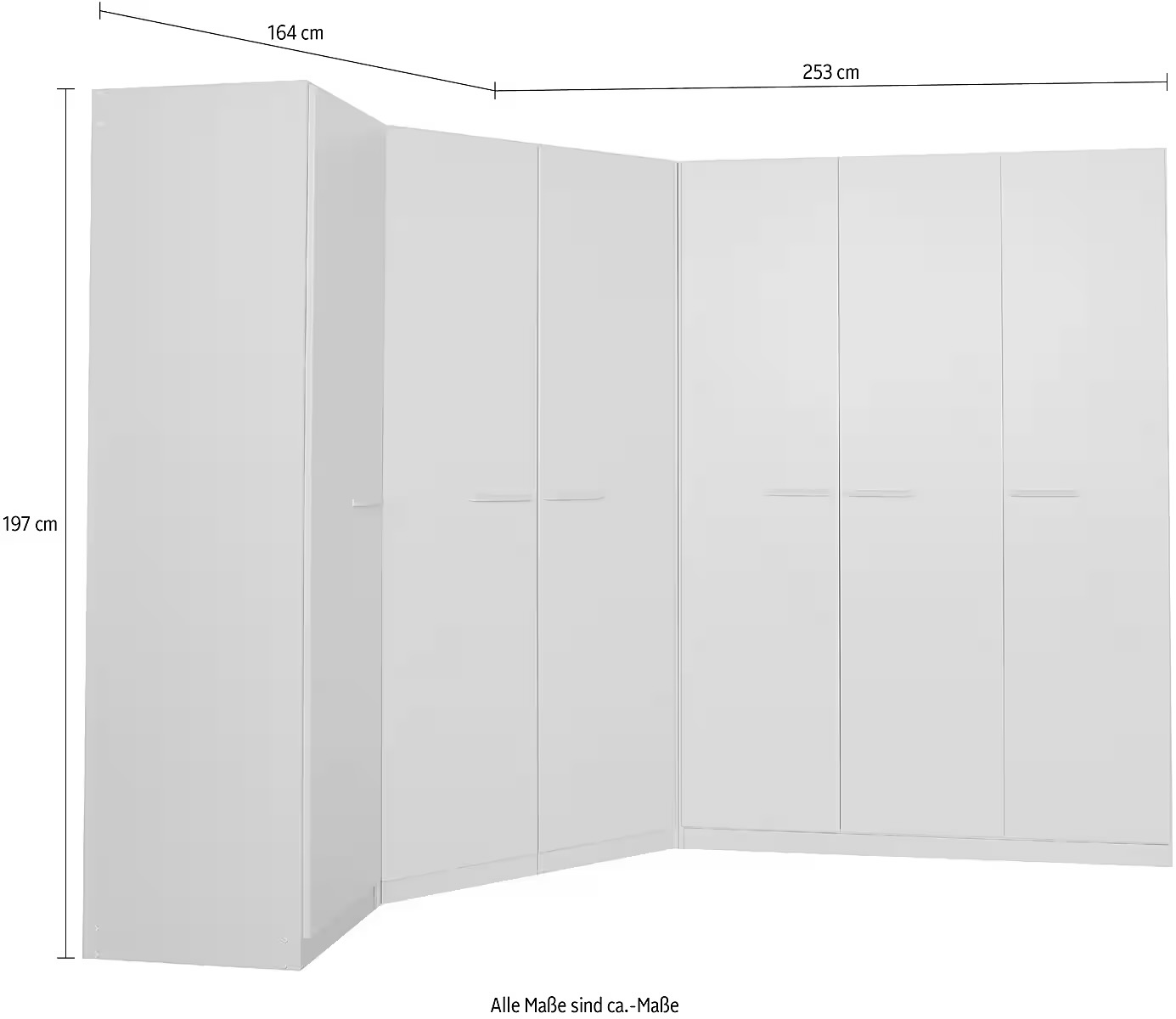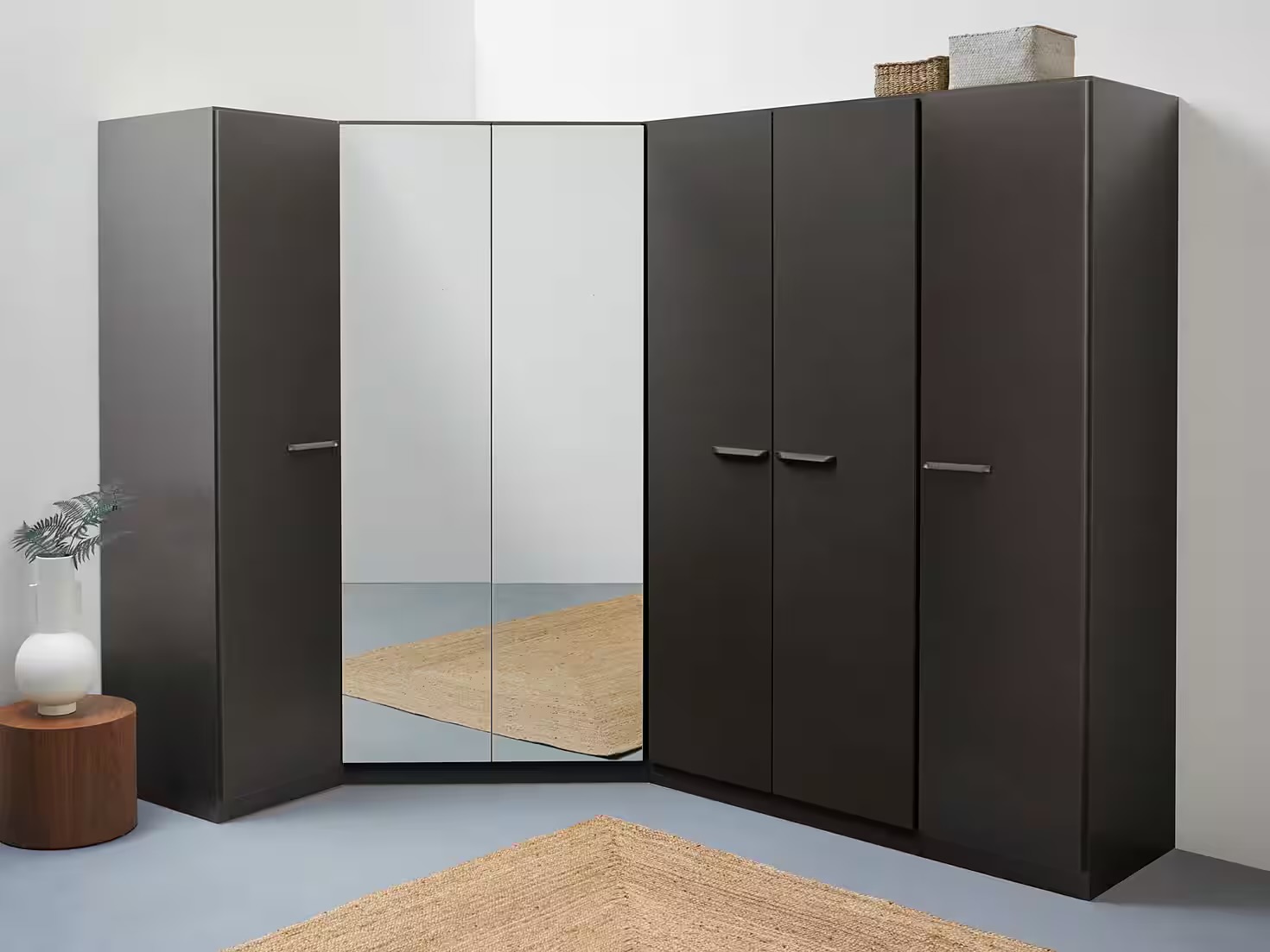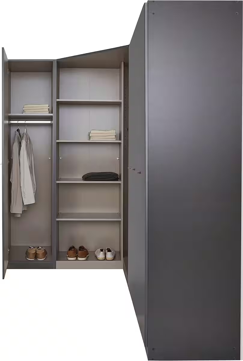 Dulap pe colț 164/253 cm, 6 uși batante, culoare gri antracit, compartimentare premium, 197 cm înălțime