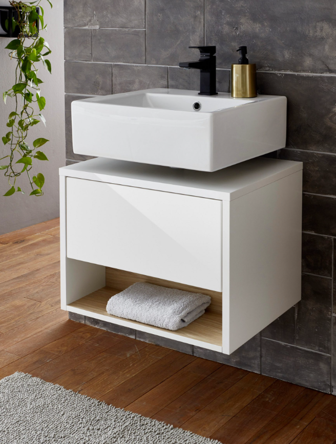 Această mască de chiuvetă este soluția ideală pentru a adăuga o notă de eleganță și funcționalitate băii tale. Designul modern, cu linii curate și finisaj alb lucios, se integrează perfect în orice decor contemporan, oferind în același timp suficient spațiu de depozitare pentru articolele esențiale de baie. Compartimentul deschis de la bază adaugă un element practic, fiind perfect pentru acces facil la prosoape sau alte obiecte de uz zilnic. Finisajul interior din lemn adaugă o notă de căldură, echilibrând stilul minimalist cu un sentiment de confort. Cu această mască de chiuvetă, vei reuși să îmbini estetica rafinată cu utilitatea, creând astfel un spațiu de baie organizat și plăcut.