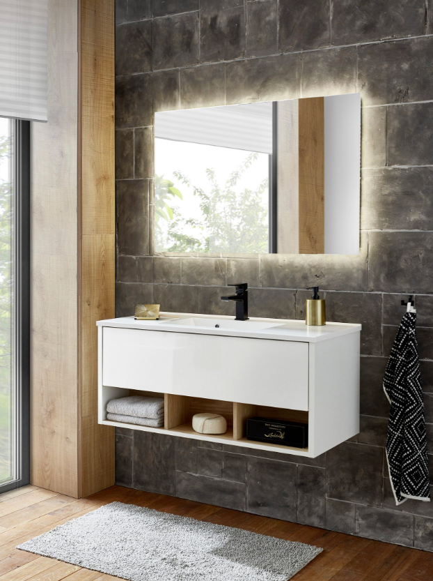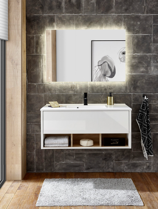 Adaugă eleganță și funcționalitate băii tale cu această oglindă modernă cu iluminare LED, concepută pentru a oferi un plus de lumină și rafinament spațiului. Cu o lățime de 100 cm și o înălțime de 65 cm, oglinda are un design pătrat și minimalist, perfect pentru interioarele contemporane. Rama este realizată din material pe bază de lemn, iar sistemul LED integrat emite o lumină alb neutru, ideală pentru machiaj sau îngrijire zilnică. Cu o durată de viață a LED-urilor de până la 30.000 de ore și un consum redus de energie (12,1 W), această oglindă combină estetica modernă cu eficiența energetică. Se conectează direct la rețea și oferă o iluminare uniformă, transformând baia într-un spațiu confortabil și elegant.