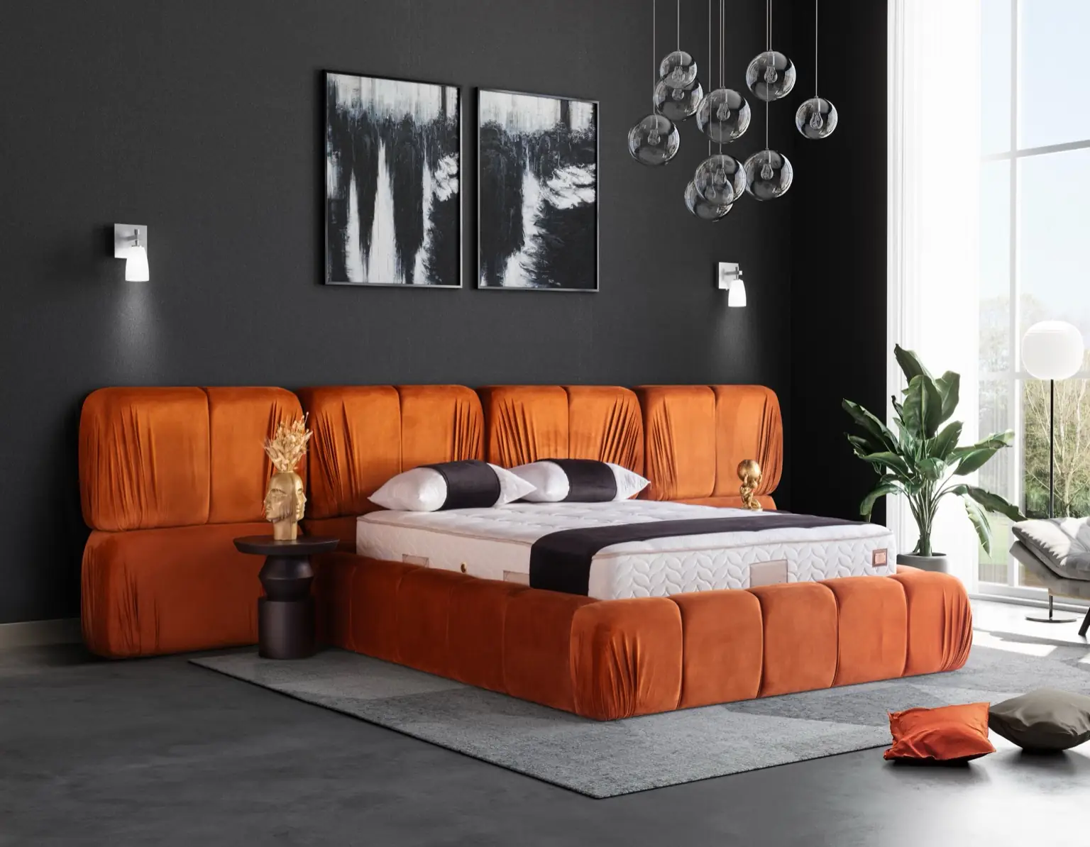 Patul AVVENTO redefinește eleganța contemporană printr-un design spectaculos, cu volum generos și linii fluide ce inspiră rafinament și confort absolut. Tapițat integral în catifea premium cu reflexe arămii, acest model se impune ca piesa centrală a oricărui dormitor de lux.
