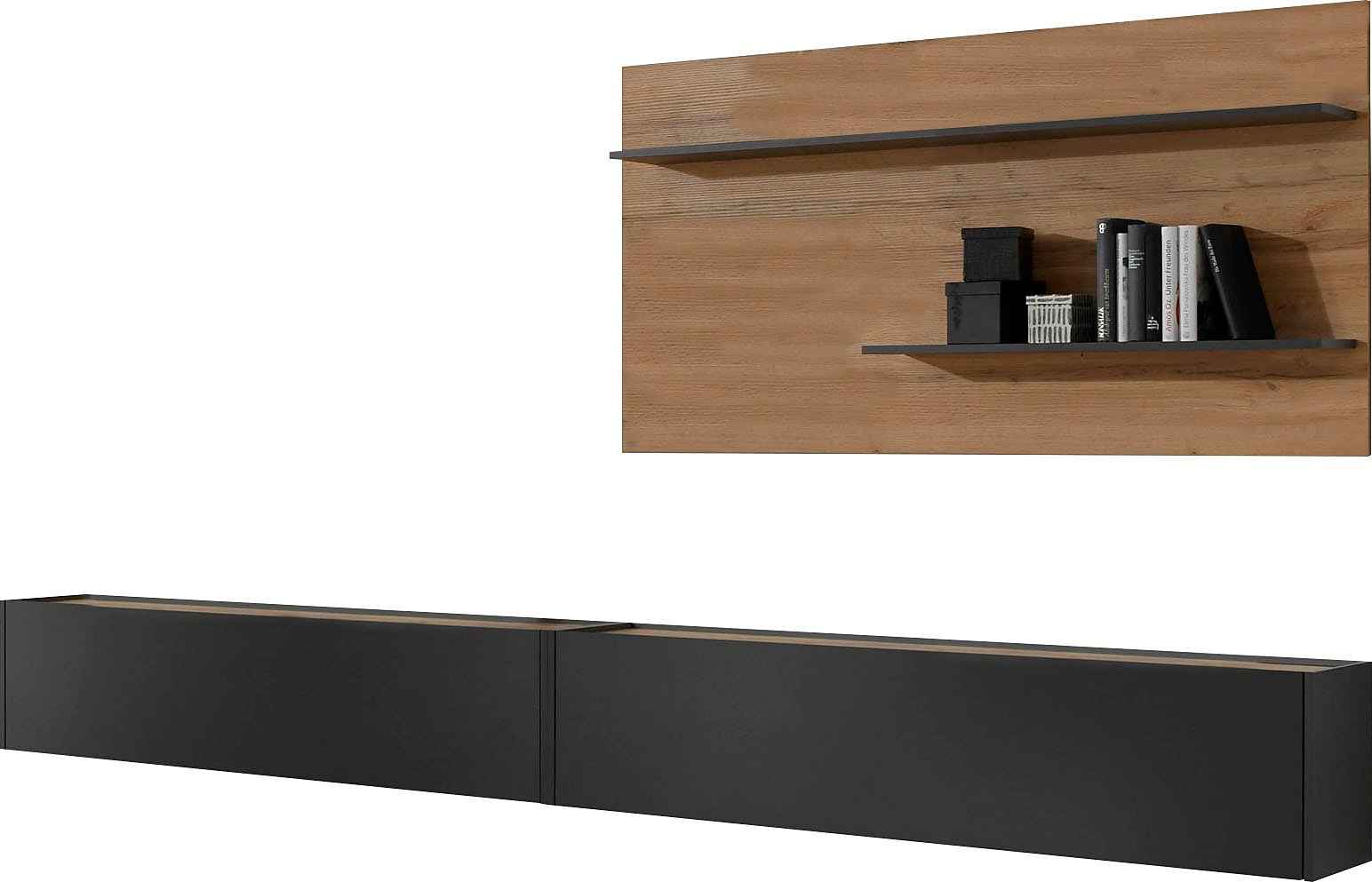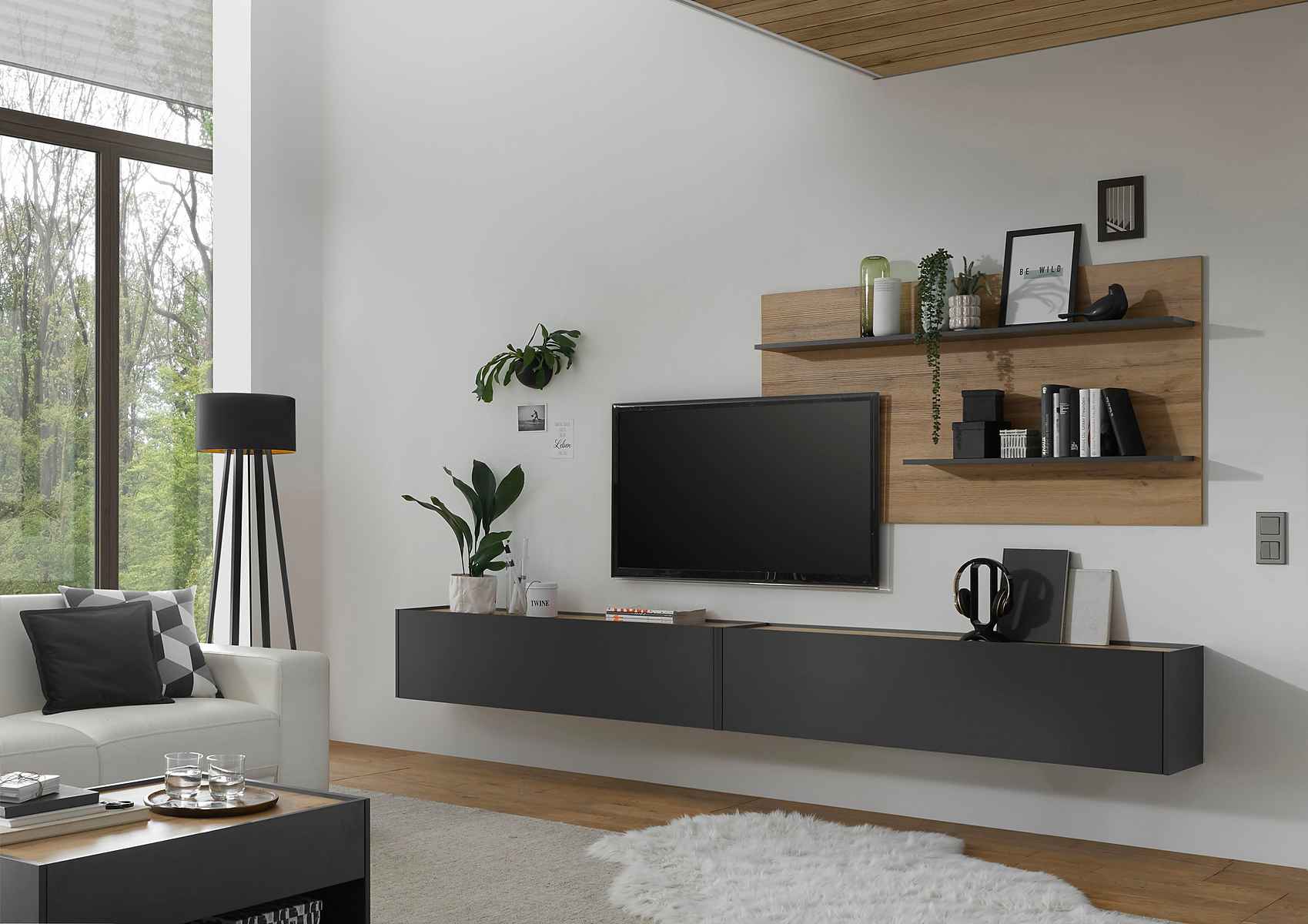 Acest set de living modern și sofisticat combină eleganța minimalistă cu funcționalitatea practică. Finisat într-o nuanță elegantă de negru mat, cu accente din lemn natural, acest set aduce un contrast plăcut și o notă de rafinament oricărui interior. Dulapurile suspendate oferă spațiu de depozitare generos, păstrând în același timp un aspect aerisit și ordonat. Rafturile deschise sunt perfecte pentru expunerea cărților, plantelor sau obiectelor decorative, adăugând un plus de personalitate spațiului. Ideal pentru un living contemporan, acest set creează un ambient modern și primitor, fiind o alegere excelentă pentru cei care apreciază designul sofisticat și funcționalitatea.