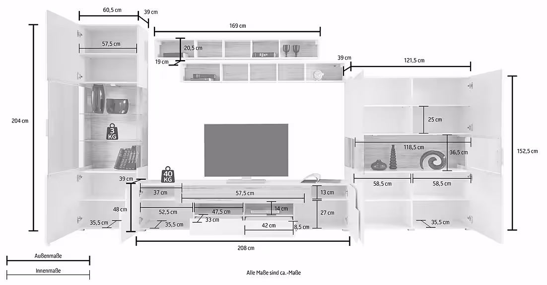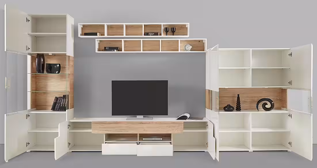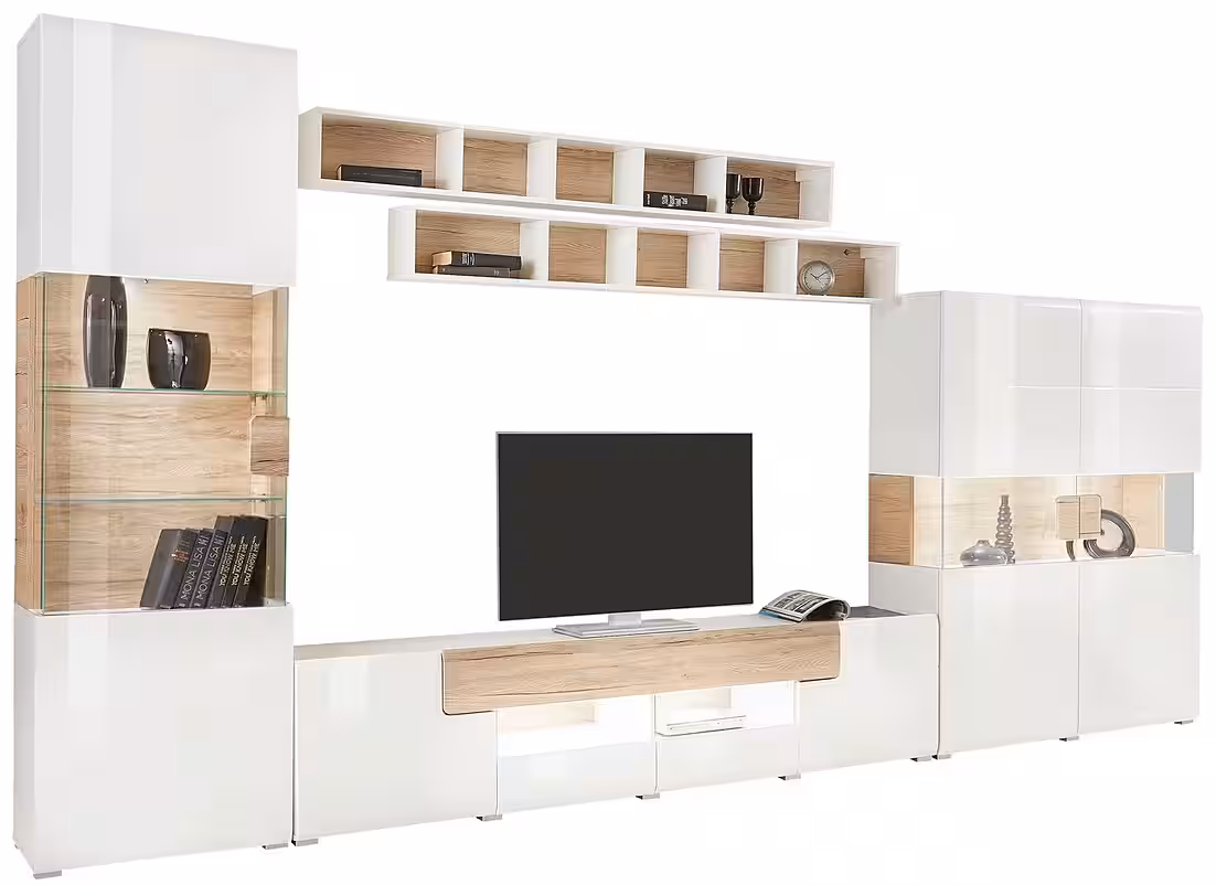 Set living format din 5 piese, fronturi lucioase, culoare alb cu stejar, 391 cm lungime